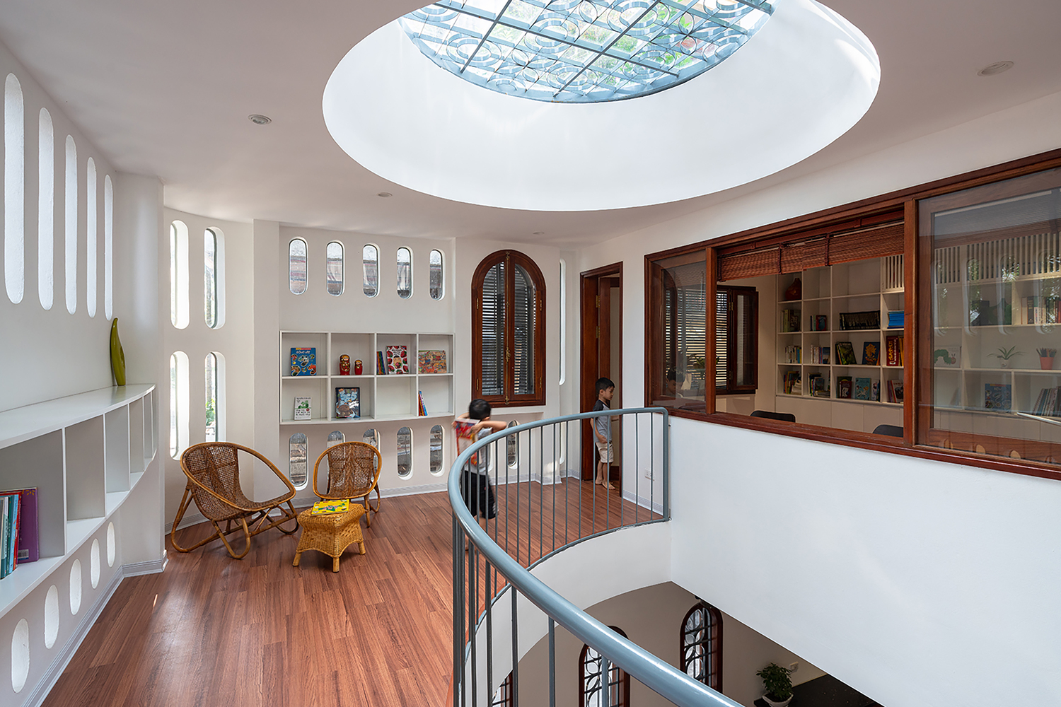 Tủ sách và nội thất được bố trí cùng với sự lưu thông này nên nó có chức năng như một thư viện nhỏ trong nhà và mọi người có thể lựa chọn nơi làm việc, học tập hay đọc cuốn sách yêu thích. Bằng cách lắp đặt một khoảng trống ở tầng hai và một đèn tròn phía trên, không gian trở nên tràn ngập ánh sáng tự nhiên và cây xanh xung quanh. Khoảng trống này kết nối qua 3 tầng, khơi gợi sự giao tiếp tương tác bên trong ngôi nhà. Phòng ăn-khách được đặt ở tầng một. Ánh sáng tự nhiên có thể chiếu từ đèn trên xuống tầng 1 qua khoảng trống.