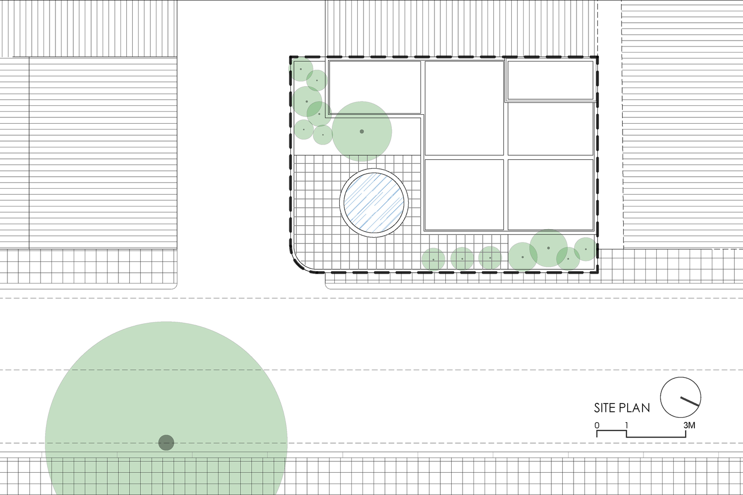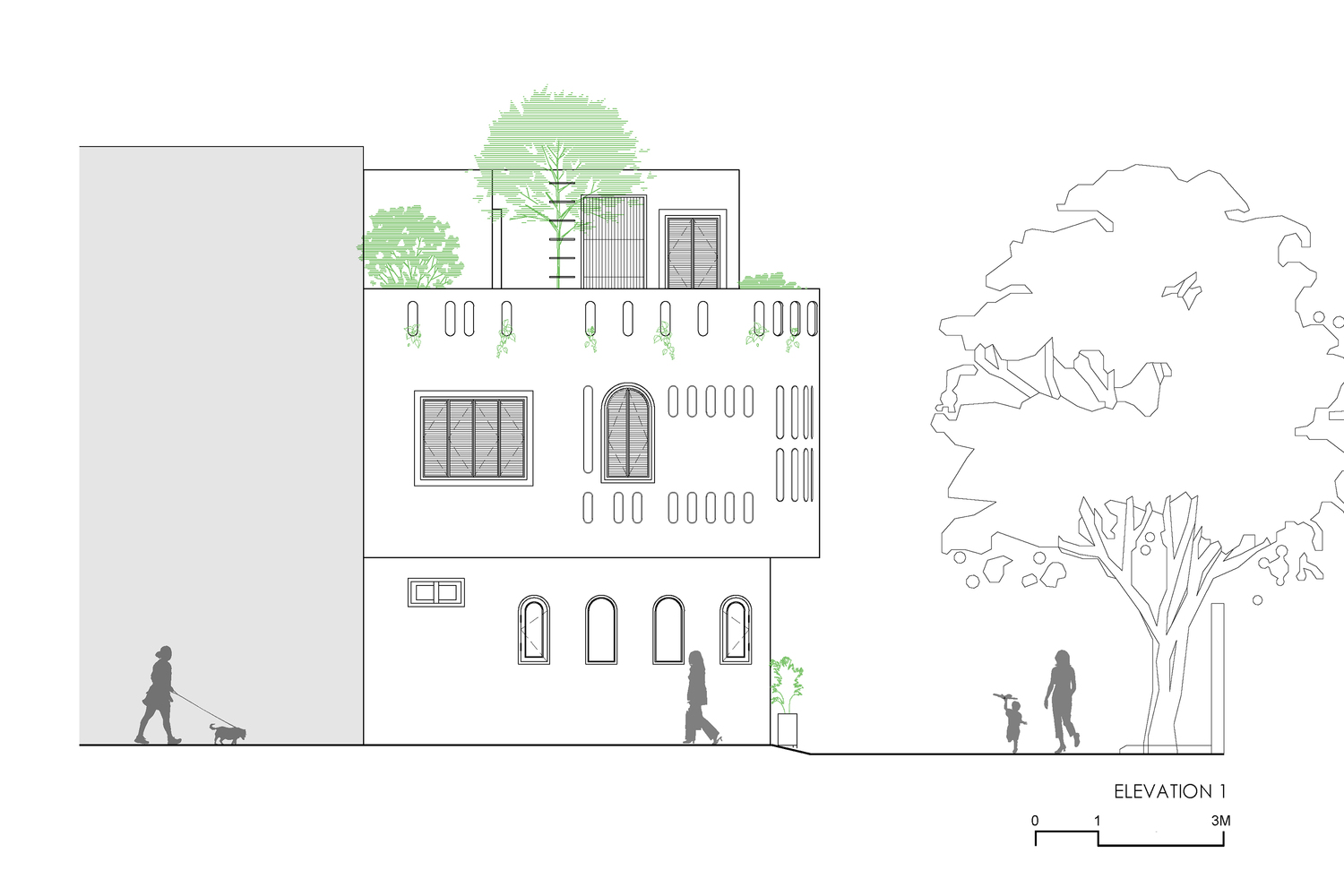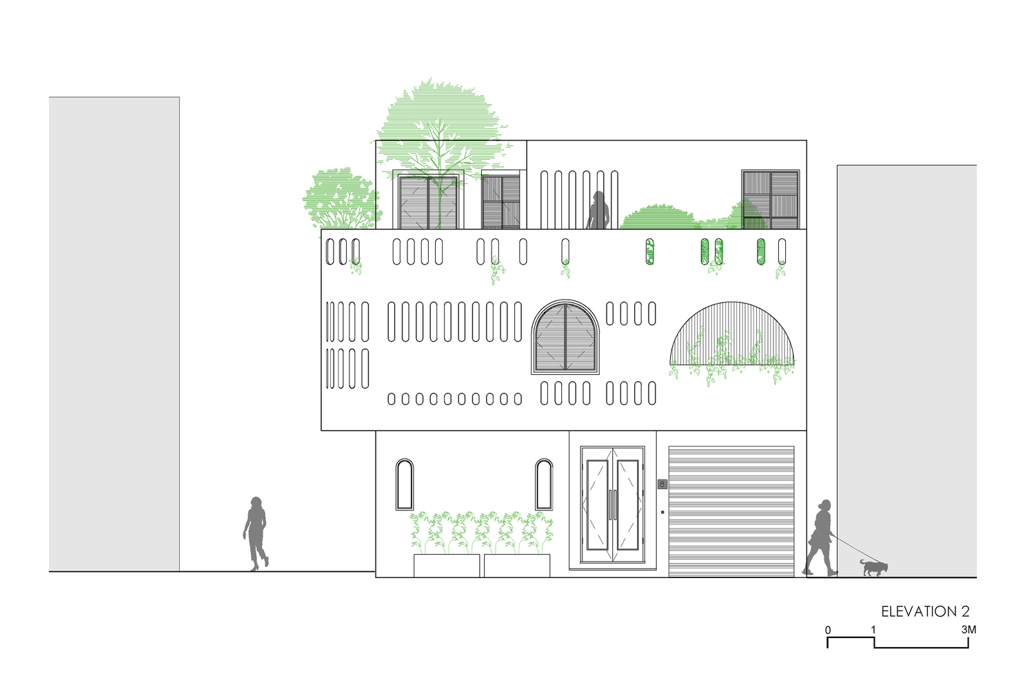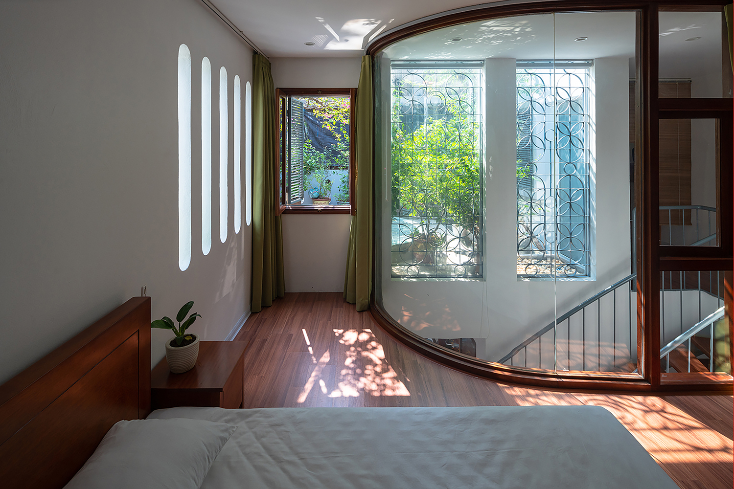 Phòng ngủ tại 2F và 3F được thiết kế mở ra ban công xanh mát và sân vườn trên sân thượng nên luôn đón được luồng không khí trong lành. Khu vườn trên mái – nơi mà chủ nhân thích chăm sóc – giúp bảo vệ ngôi nhà khỏi ánh nắng nóng trực tiếp. Mặt tiền được thiết kế với nhiều lỗ hình ô van vừa lấy sáng tự nhiên vừa đảm bảo an ninh cho ngôi nhà. Ánh sáng từ ngôi nhà vào buổi tối dù là những lỗ hổng và cây xanh hắt ra từ ban công và sân vườn trên sân thượng làm cho góc phố trở nên ấm cúng và sinh động.