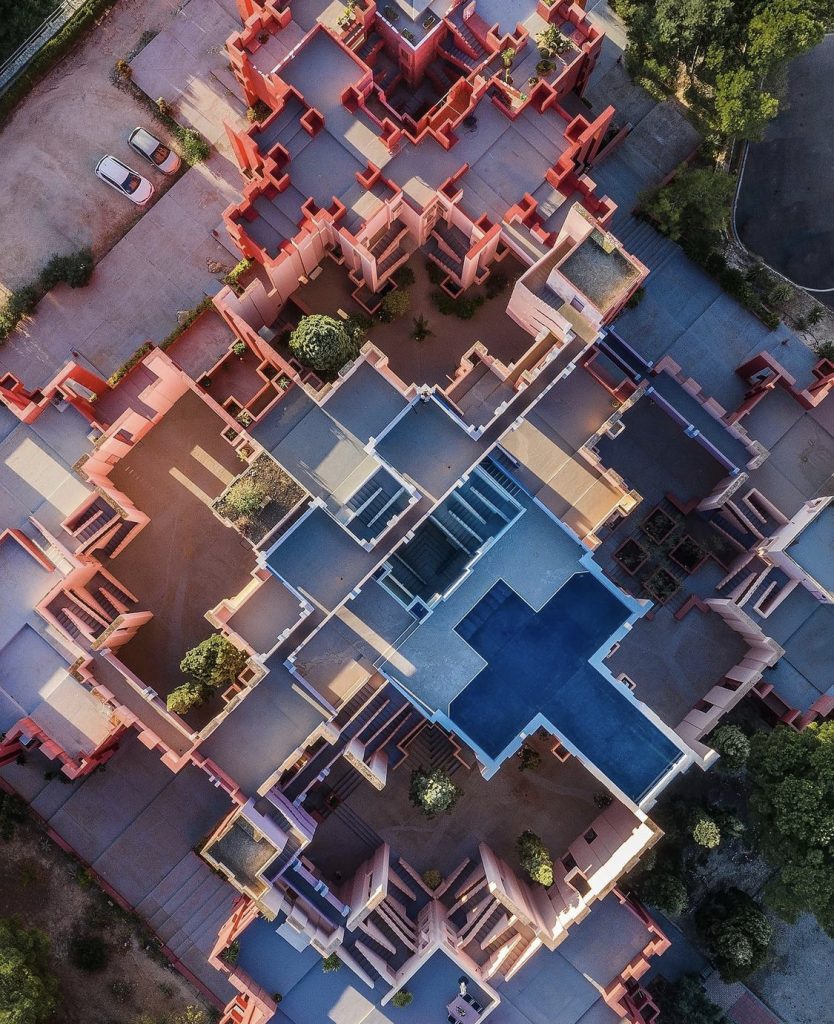 Các tông màu sơn đỏ khác nhau bao phủ mặt tiền bên ngoài, làm nổi bật sự tương phản với cảnh quan. Mặt khác, các cầu thang và bề mặt lưu thông được xử lý bằng các tông màu xanh khác nhau, từ xanh da trời đến chàm và tím, tùy thuộc vào mục đích tạo sự tương phản hay sự liên tục về mặt thị giác với bầu trời.