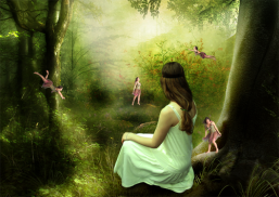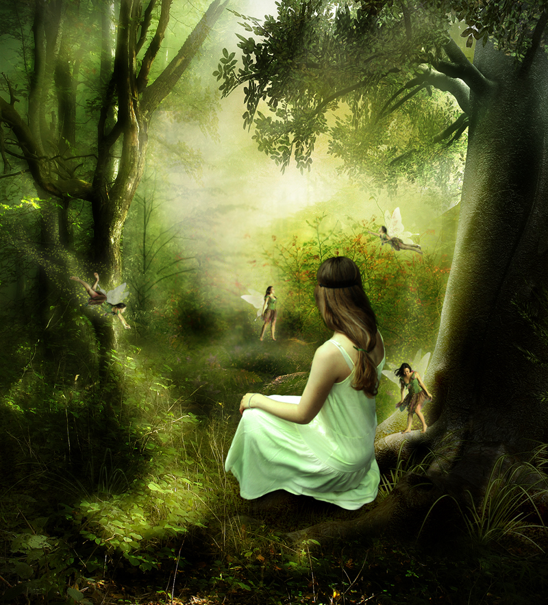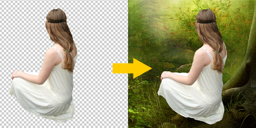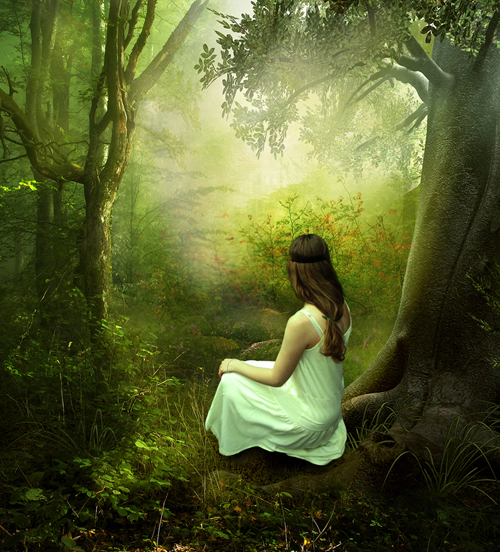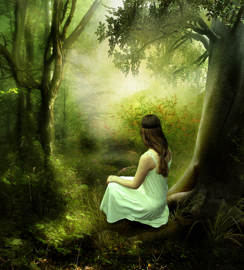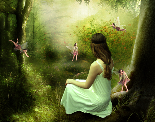 B1 : Trước tiền là bạn phải tách hình CÔ GÁI trong rừng với THIÊN THẦN ra khỏi nền cũ và đưa vào background RỪNG nhé. Bạn có thể dùng các công cụ chọn vùng hoặc pentool, không biết cách sử dụng thì ” cái gì không biết cứ tra GOOGLE ” :D.