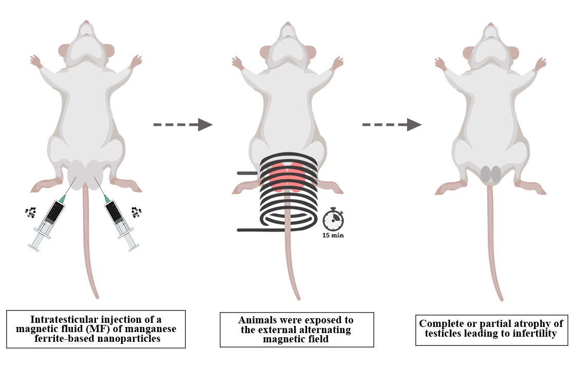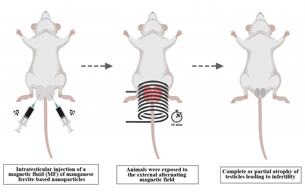 Các thanh nano sắt oxit này chỉ nhỏ bằng 1/1000 sợi tóc nên có thể di chuyển dễ dàng trong mạch máu. Chúng sẽ bị nam châm hút về phía tinh hoàn. Sau đó, nam châm được lấy ra và thay bằng một cuộn dây điện.