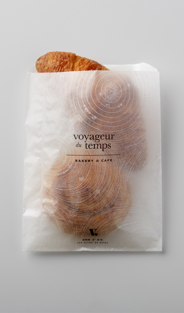 Và chiếc túi đơn giản được thiết kế cho một tiệm café tên Voyageur du Temps (tiếng Pháp có nghĩa là “nhà du hành thời gian”) không giấu đi những chiếc bánh ngon lành bên trong. Ngược lại, nó tận dụng chất liệu nửa trong suốt không chỉ để sản phẩm có thể nhìn thấy được từ bên ngoài mà đây còn là một sự phát triển thương hiệu cũng như thêm vào các điểm nhấn trực quan với hoạ tiết bản đồ địa hình nhằm tạo sự liên quan đến chủ đề du hành thời gian.