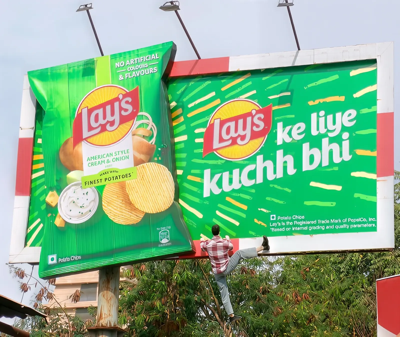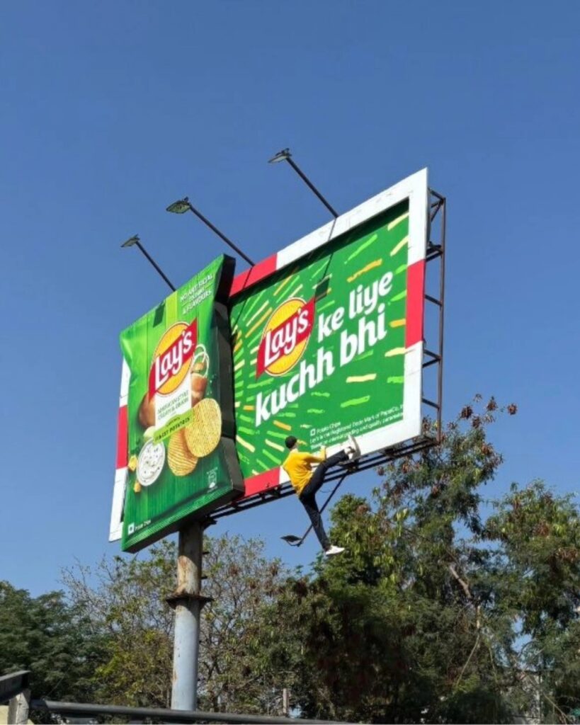 Hình ảnh một người đàn ông trèo lên billboard để “giành lấy” gói Lay’s khổng lồ, ý tưởng đơn giản nhưng đủ khiến người đi đường phải chú ý. Đây là chiến dịch OOH của Lay’s tại Ấn Độ, hợp tác cùng MOMS OUTDOOR.