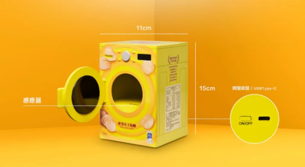Lay’s Washing Finger Machine là một chiếc hộp siêu nhỏ với hình dáng như một chiếc máy giặt có khả năng làm sạch các mảnh vụn cứng đầu khỏi ngón tay bạn sau khi thưởng thức món snack khoái khẩu. Có kích thước 15x11cm cùng vẻ ngoài trông như một hộp đựng khoai tây chiên, chiếc “máy giặt tay” mini này còn được trang bị thêm một cổng USB-C để bạn thoải mái cắm vào máy tính và nạp năng lượng cho nó tại bất kỳ đâu.