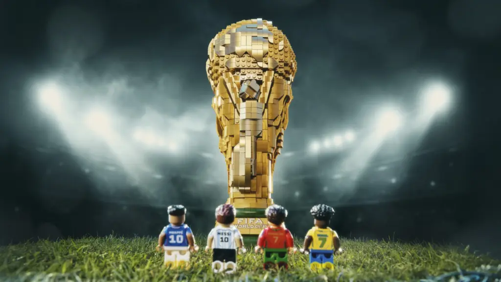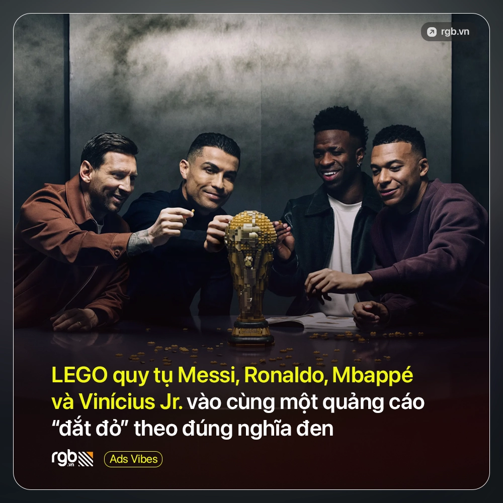 Trong lần hợp tác này, LEGO quy tụ bốn cái tên đình đám: Lionel Messi, Cristiano Ronaldo, Kylian Mbappé và Vinícius Jr. – lần đầu tiên xuất hiện cùng nhau trong một không gian sáng tạo chung. Không chỉ được “lắp ráp”, các cầu thủ còn trực tiếp xuất hiện trong chiến dịch, đặc biệt xoay quanh việc dựng chiếc cúp World Cup phiên bản LEGO, khiến toàn bộ ý tưởng trở nên sống động và cụ thể hơn.