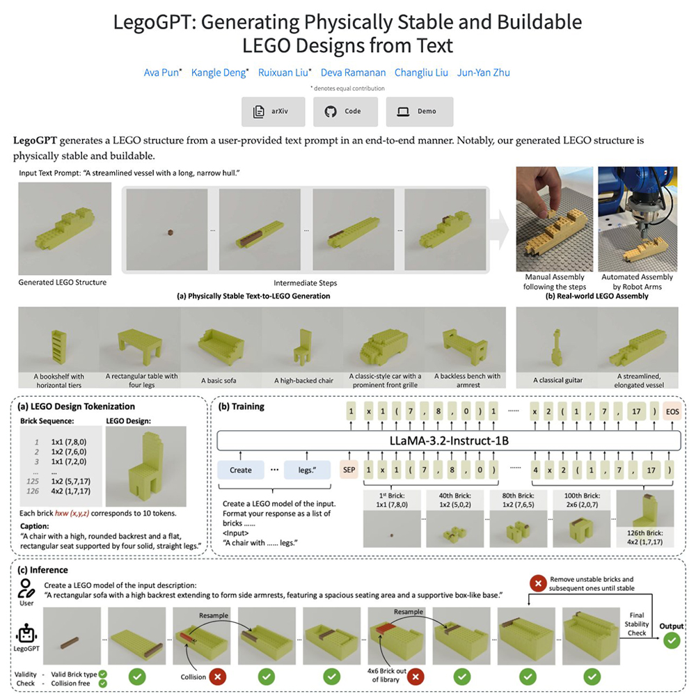 Các nhà nghiên cứu tại Đại học Carnegie Mellon vừa giới thiệu LegoGPT – một mô hình AI có khả năng biến mô tả văn bản thành các thiết kế LEGO có thể lắp ráp và ổn định trong thế giới thực. Khác với các công cụ AI tạo hình 3D trước đây thường bỏ qua yếu tố vật lý, LegoGPT đảm bảo rằng mỗi thiết kế đều tuân thủ các nguyên tắc về trọng lực và kết cấu, giúp người dùng dễ dàng hiện thực hóa ý tưởng của mình bằng các khối LEGO tiêu chuẩn.