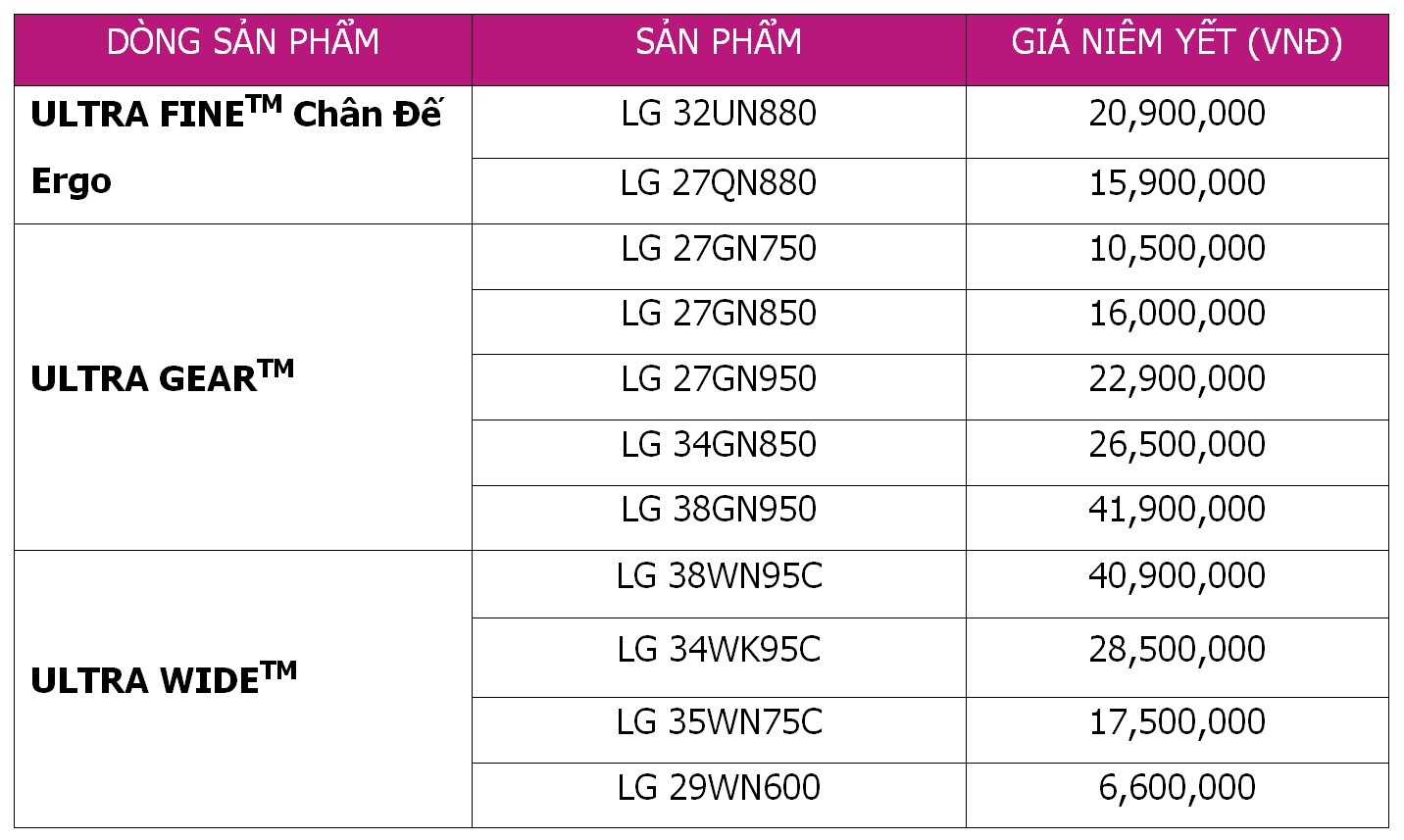 Giá niêm yết của các dòng màn hình: ULTRA FINETM Chân Đế Ergo, ULTRA GEARTM VÀ ULTRA WIDETM tại Việt Nam: