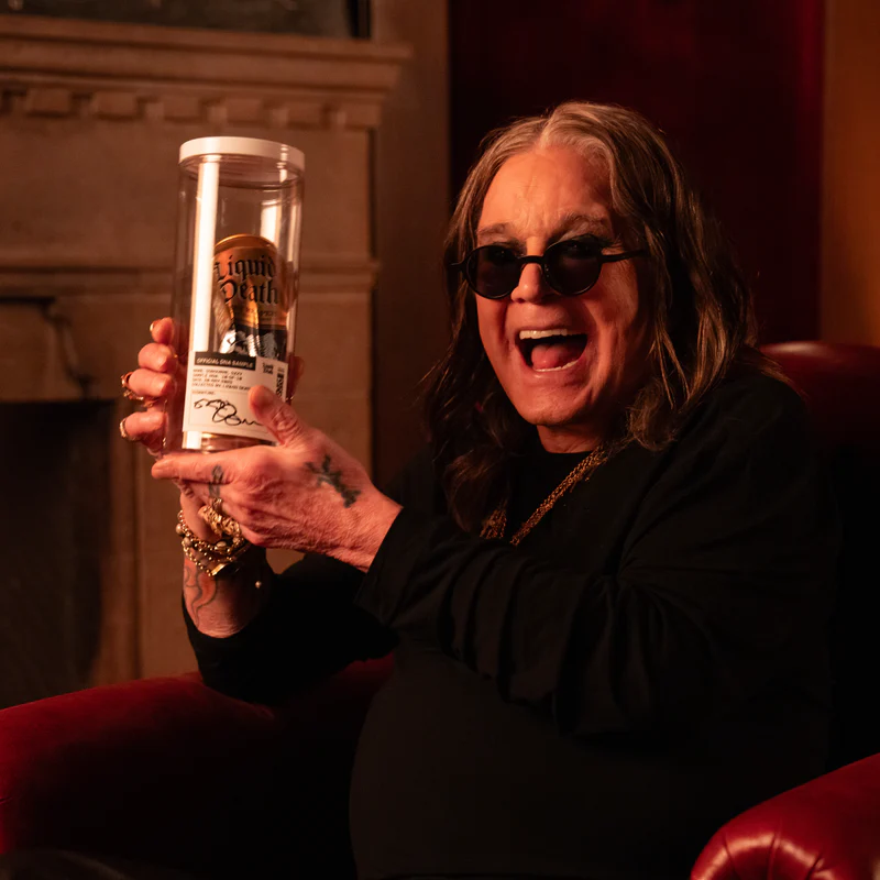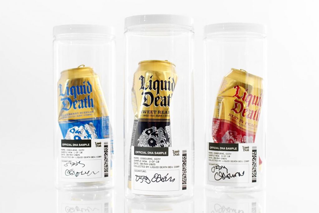 Với chiến dịch Infinite Ozzy, Liquid Death trình làng bộ sưu tập siêu giới hạn gồm 10 lon trà lạnh chứa ADN thật của Ozzy Osbourne – được thu thập ngay sau khi chính “Hoàng tử bóng tối” (The Prince of Darkness) đã uống từ những lon này. Vâng, hoàn toàn nghiêm túc. Mỗi lon được bán với giá 450 USD (khoảng gần 12 triệu đồng), đựng trong hộp bảo quản phòng thí nghiệm, kèm chữ ký tay của Ozzy.