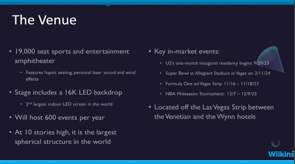 The Venue * Khán phòng với 19.000 chỗ ngồi - Trang bị ghế ngồi xúc giác, hệ thống âm thanh laser cá nhân cho từng ghế và hiệu ứng gió * Sân khấu với màn hình LED 16K - Màn hình LED trong nhà lớn thứ 2 thế giới * Là nơi tổ chức 600 sự kiện mỗi năm * Với chiều cao 10 tầng, đây là công trình hình cầu lớn nhất thế giới