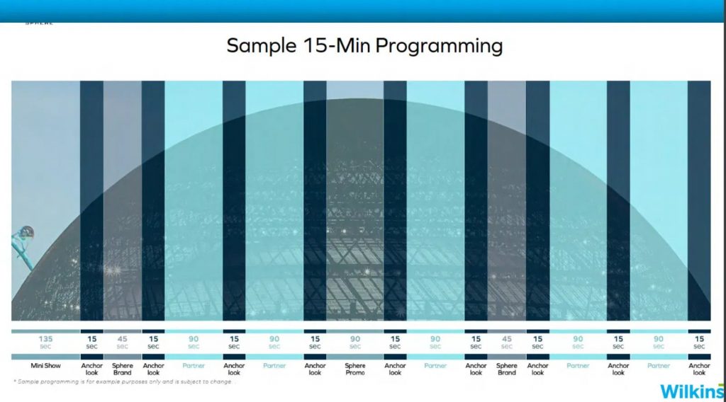 The Sign * Biển quảng cáo 3D công nghệ anamorphic hình cầu, hiển thị ở mọi góc độ * Có thể được nhìn thấy từ Las Vegas Strip (con đường nhộn nhịp nhất khu vực) và các khách sạn lân cận, với tầm nhìn không bị cản trở từ sân gôn Wynn * Số liệu dự kiến hàng năm: - Khách của Sphere: 6 triệu lượt - Khách đến Las Vegas: 42 triệu lượt - Số lần hiển thị toàn cầu ước tính: 1,7 tỷ lượt * Phát triển nội dung: - Thời gian sản xuất: 8-10 tuần - Nhân viên studio của Sphere: 300 nhà thiết kế