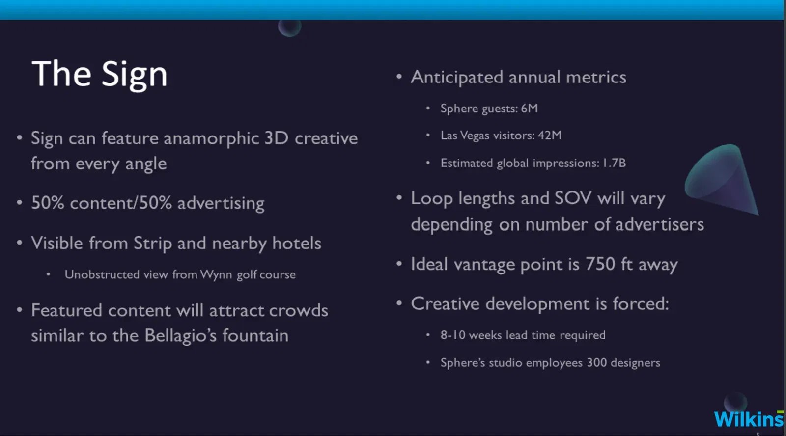 The Sign * Biển quảng cáo 3D công nghệ anamorphic hình cầu, hiển thị ở mọi góc độ * Có thể được nhìn thấy từ Las Vegas Strip (con đường nhộn nhịp nhất khu vực) và các khách sạn lân cận, với tầm nhìn không bị cản trở từ sân gôn Wynn * Số liệu dự kiến hàng năm: - Khách của Sphere: 6 triệu lượt - Khách đến Las Vegas: 42 triệu lượt - Số lần hiển thị toàn cầu ước tính: 1,7 tỷ lượt * Phát triển nội dung: - Thời gian sản xuất: 8-10 tuần - Nhân viên studio của Sphere: 300 nhà thiết kế