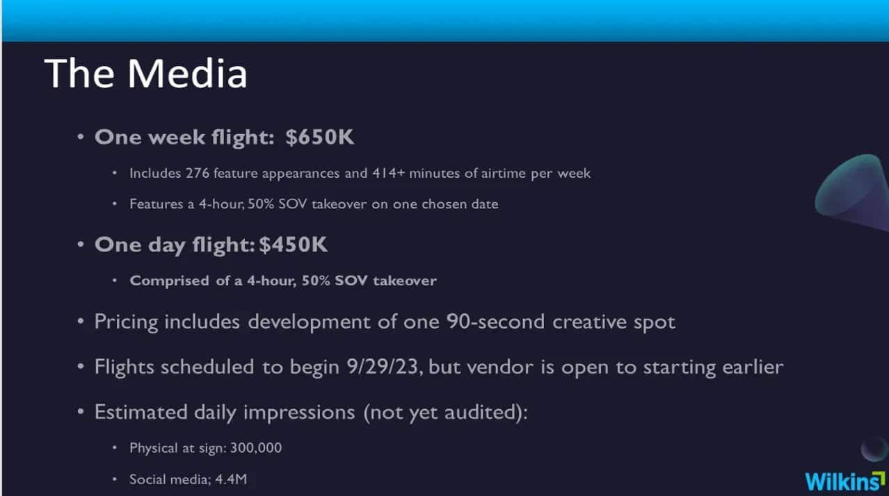The Media * Booking cho 1 tuần: 650.000 USD - Gồm 276 lần xuất hiện và hơn 414 phút chiếu nội dung/tuần * Booking cho 1 ngày: 450.000 USD * Giá đã bao gồm việc thiết kế clip quảng cáo dài 90 giây * Lượng hiển thị ước tính hàng ngày: - Trực tiếp: 300.000 - Mạng xã hội: 4.4 triệu