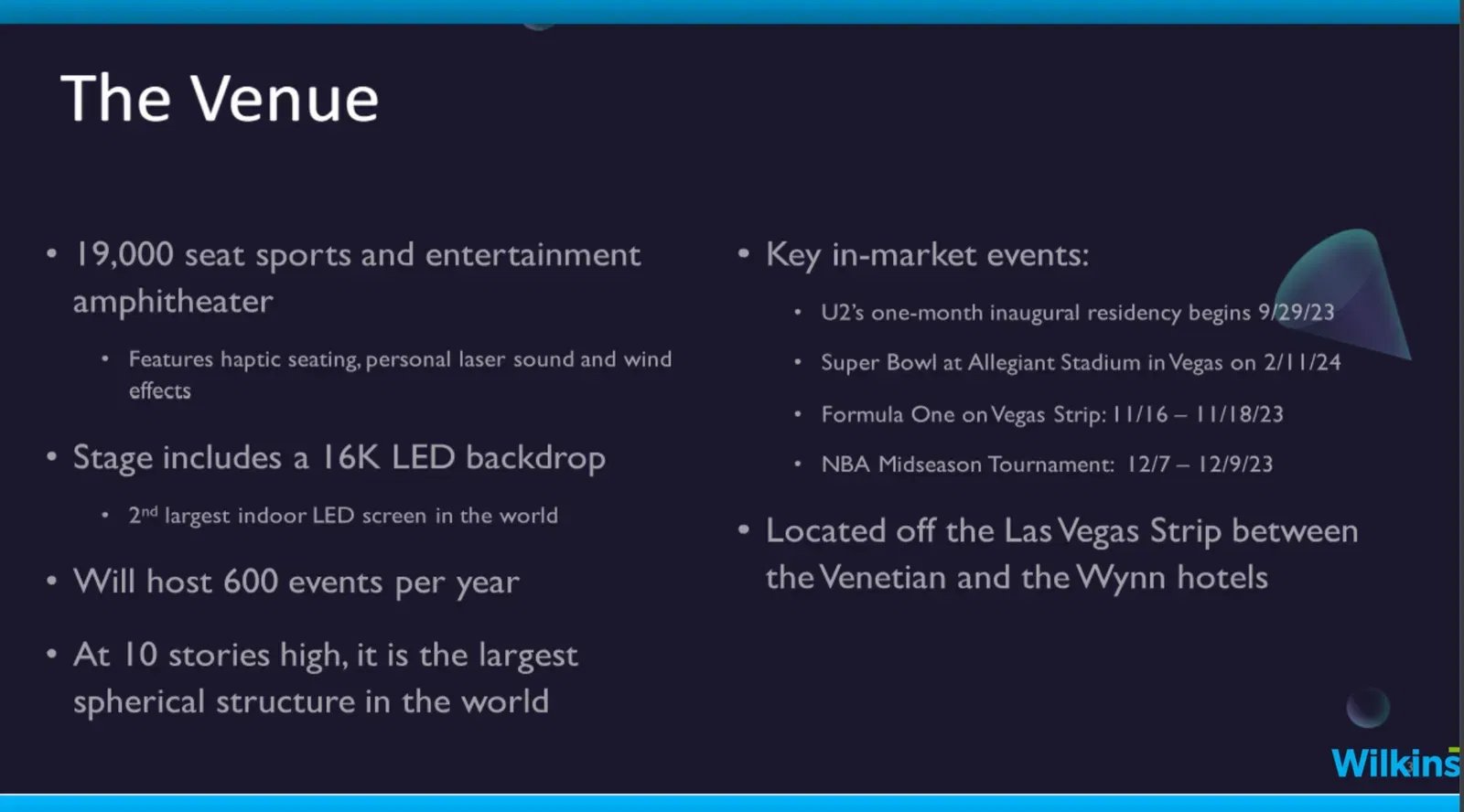 The Venue * Khán phòng với 19.000 chỗ ngồi - Trang bị ghế ngồi xúc giác, hệ thống âm thanh laser cá nhân cho từng ghế và hiệu ứng gió * Sân khấu với màn hình LED 16K - Màn hình LED trong nhà lớn thứ 2 thế giới * Là nơi tổ chức 600 sự kiện mỗi năm * Với chiều cao 10 tầng, đây là công trình hình cầu lớn nhất thế giới