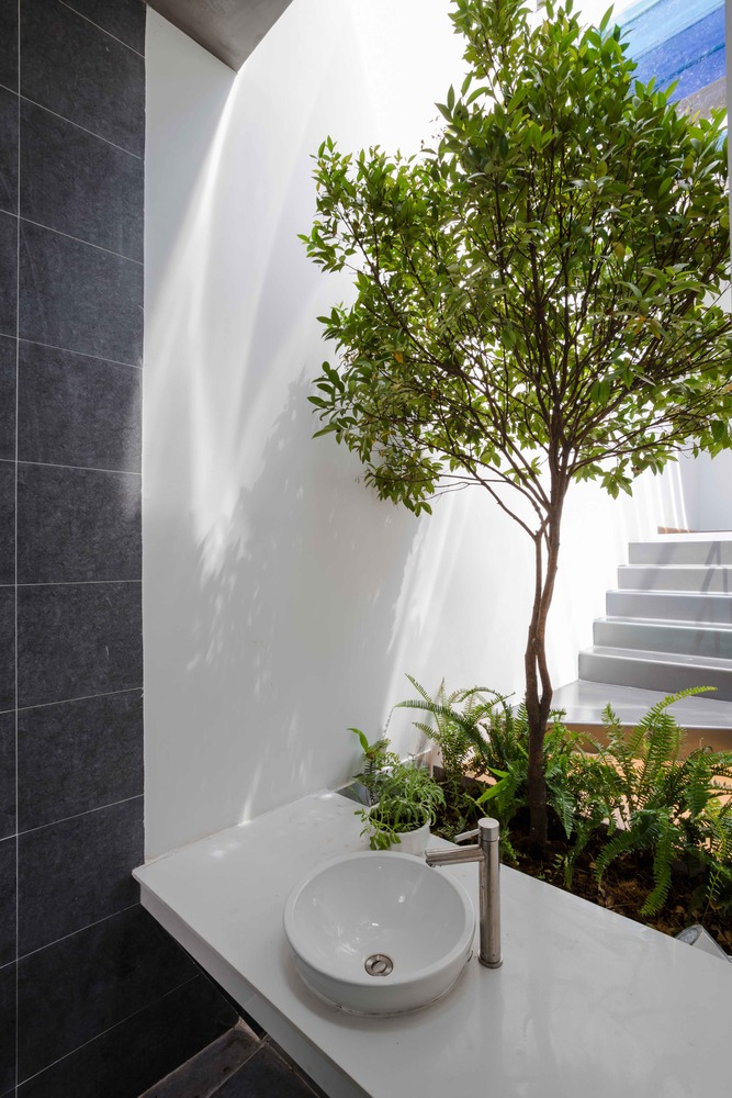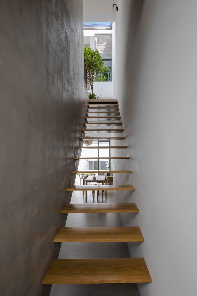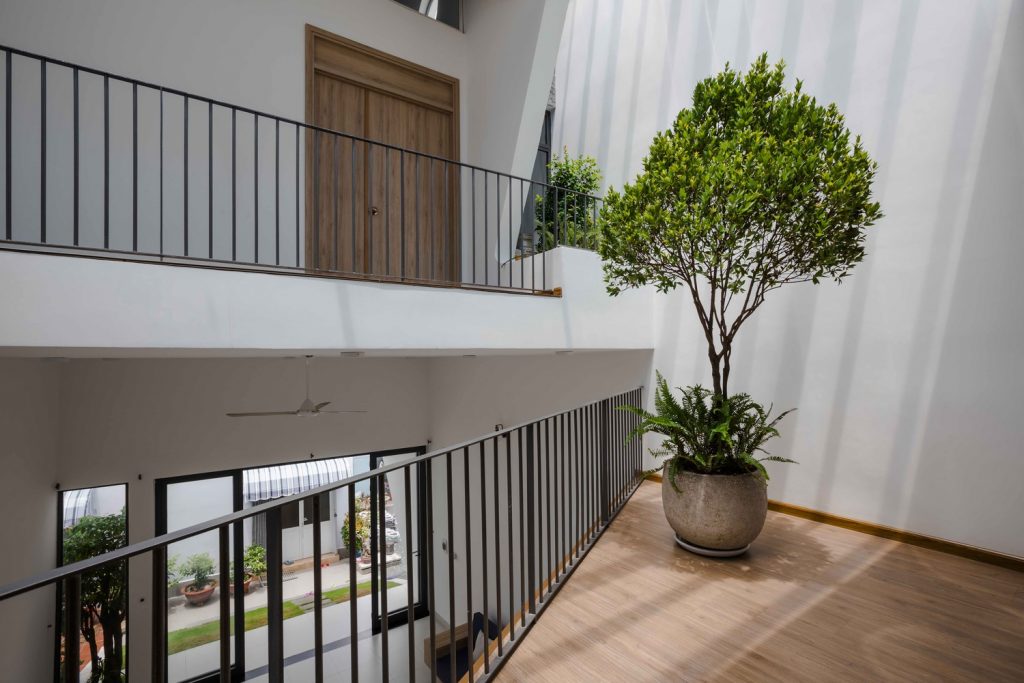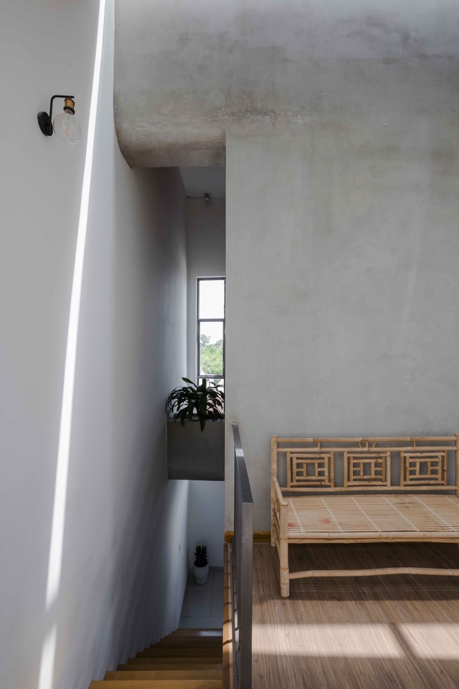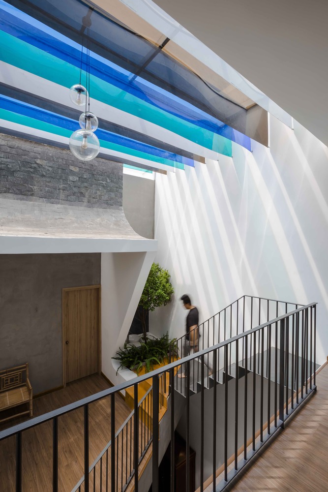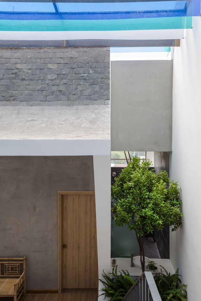 Khu vực sinh hoạt chung của ngôi nhà là sân nhỏ có mái hiên, nơi lũ trẻ có thể tận hưởng không gian thoáng đãng. Hàng hiên đầy màu sắc của Lộc house đổ bóng gợn sóng trên sàn ốp gỗ.