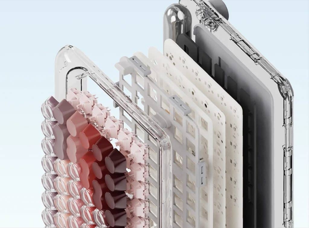 Ngay từ cái nhìn đầu tiên, bàn phím nổi bật với bảng màu gồm năm tông được chọn lọc kỹ lưỡng, gợi nhớ đến các thỏi son huyền thoại, từ đỏ thẫm đến đỏ berry. Những gam màu này được thể hiện trên các phím PBT hai tông màu, đặt trong khung nhựa mờ trong suốt tựa như một quầy trưng bày mỹ phẩm.