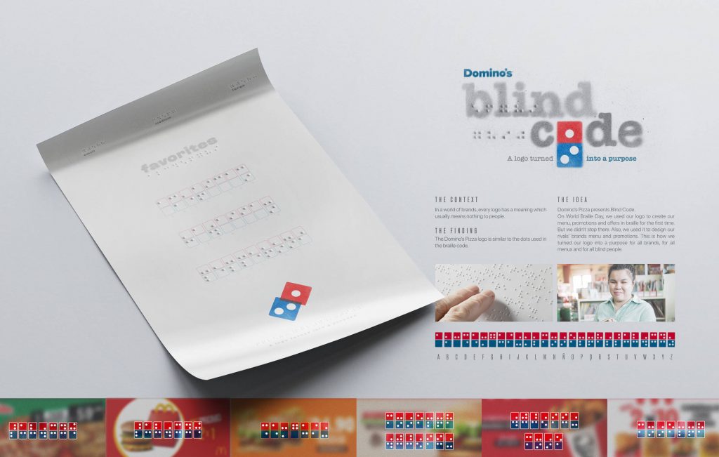 Nhận thấy logo của Domino’s khá tương tự với các dấu chấm được sử dụng trong mã chữ nổi Braille dành cho người mù, The Pub School đã dùng chính thiết kế logo này để tạo thực đơn, chương trình khuyến mãi và ưu đãi của Domino’s bằng mã chữ nổi.