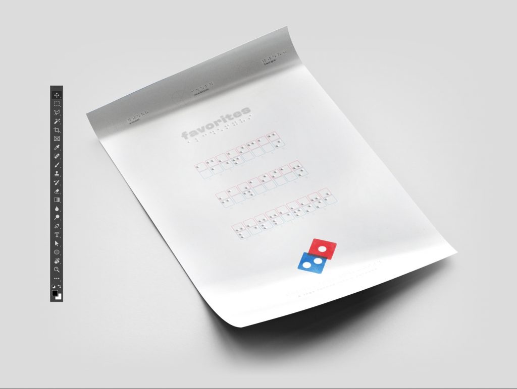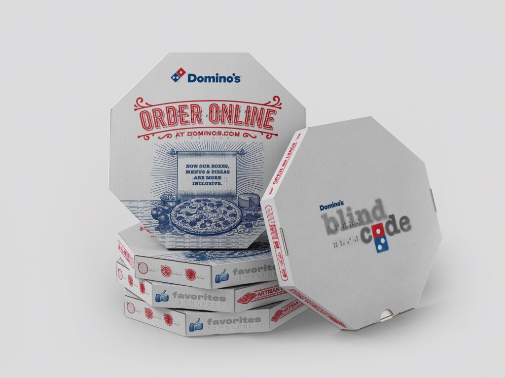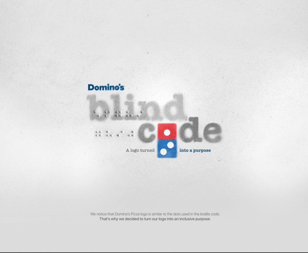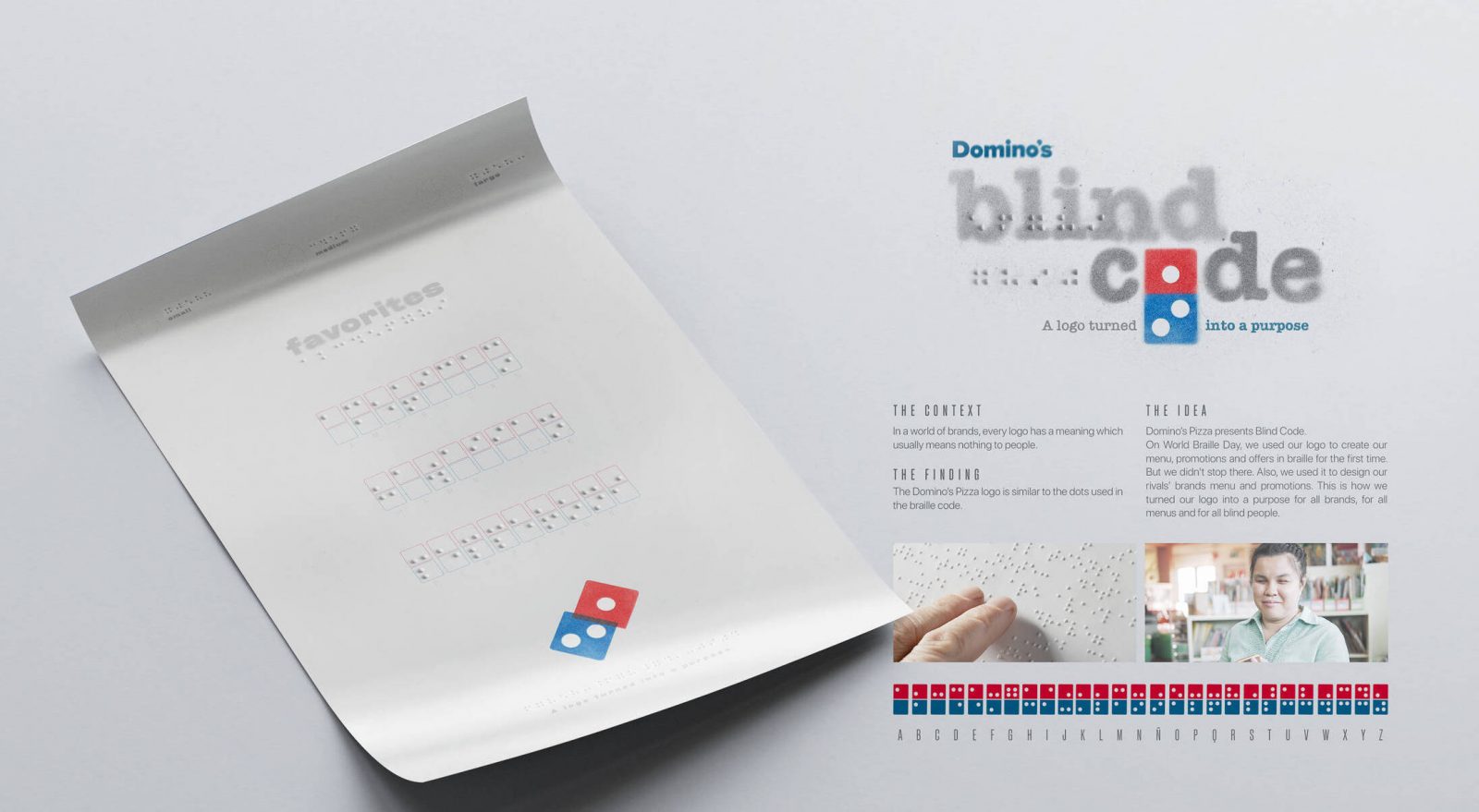 Nhận thấy logo của Domino’s khá tương tự với các dấu chấm được sử dụng trong mã chữ nổi Braille dành cho người mù, The Pub School đã dùng chính thiết kế logo này để tạo thực đơn, chương trình khuyến mãi và ưu đãi của Domino’s bằng mã chữ nổi.