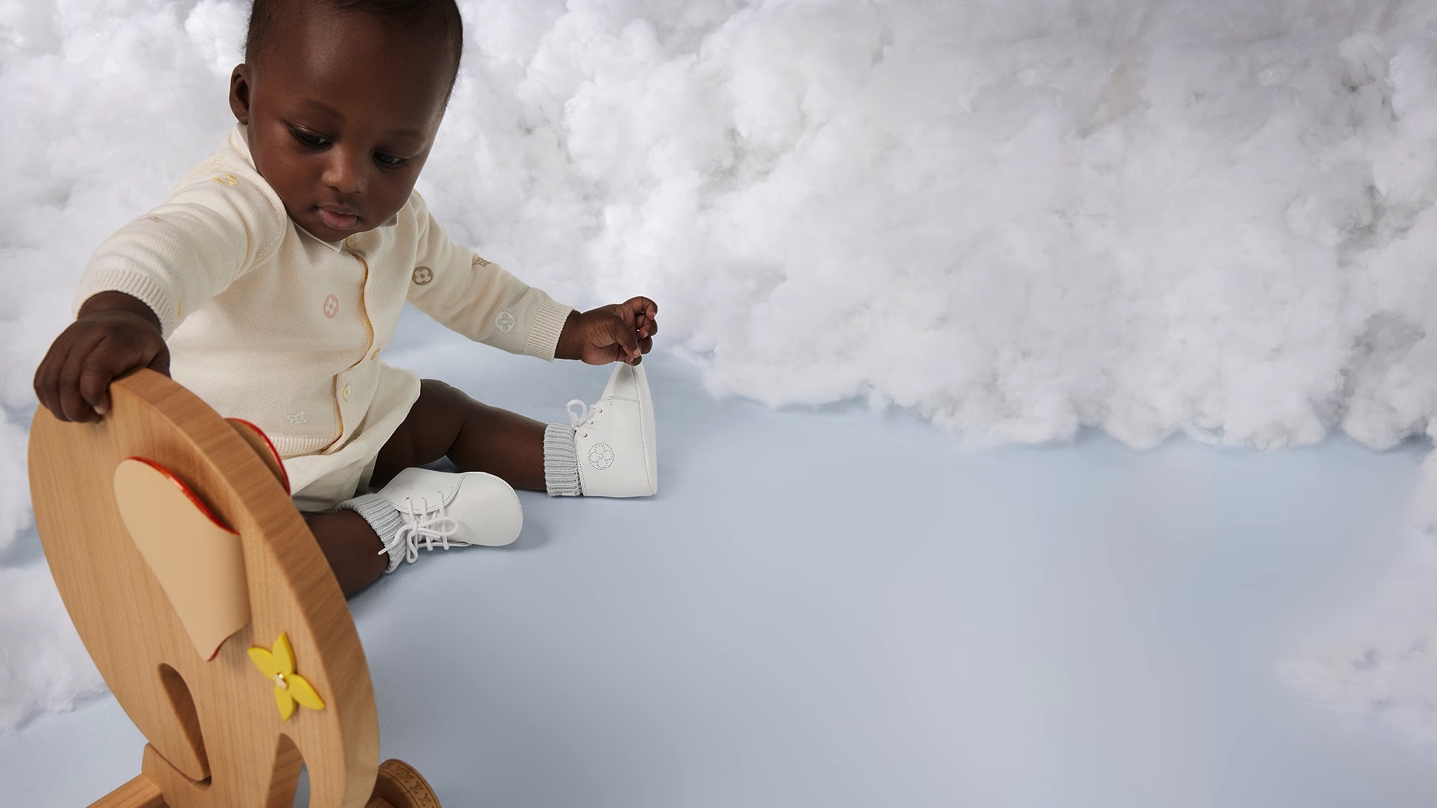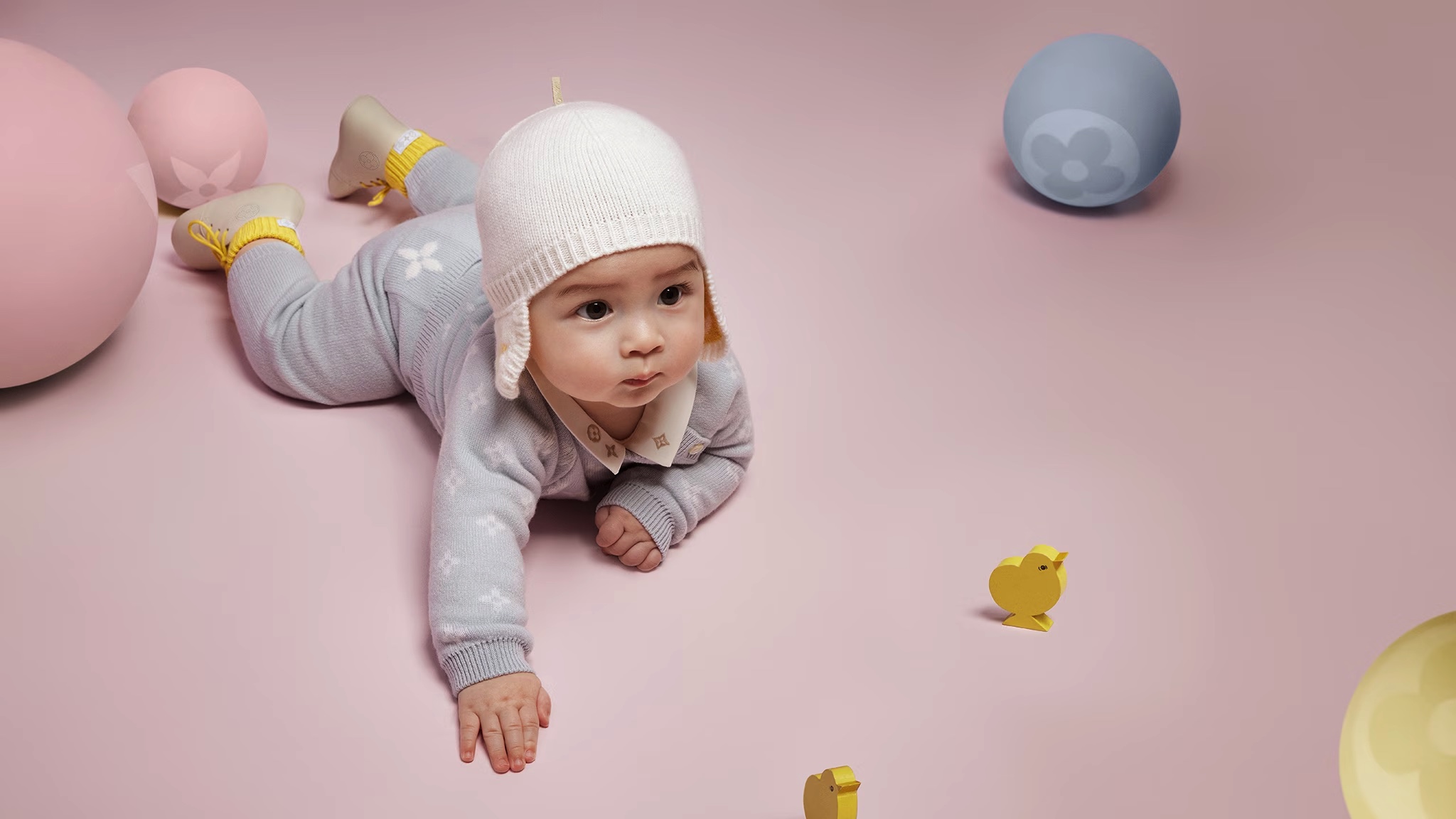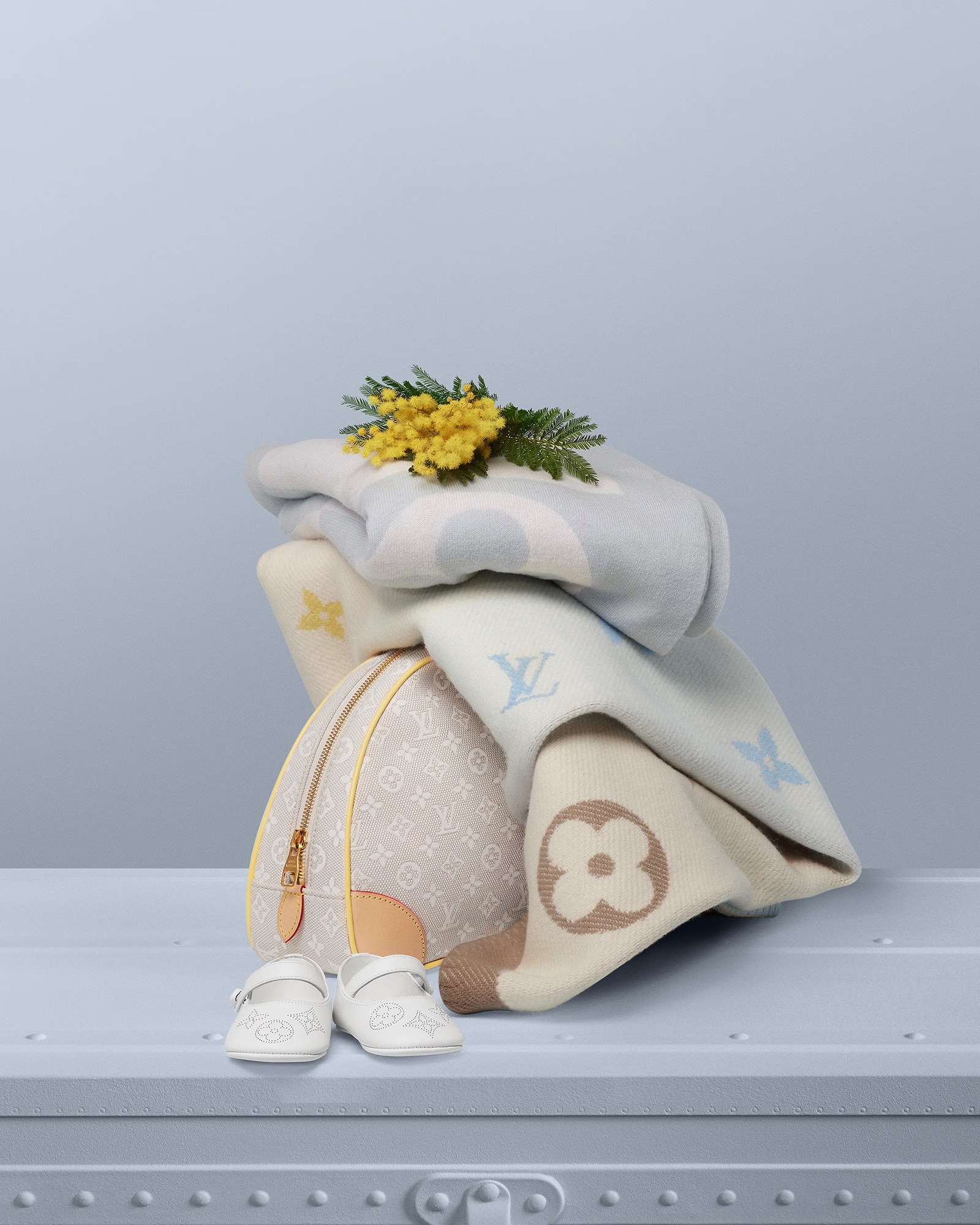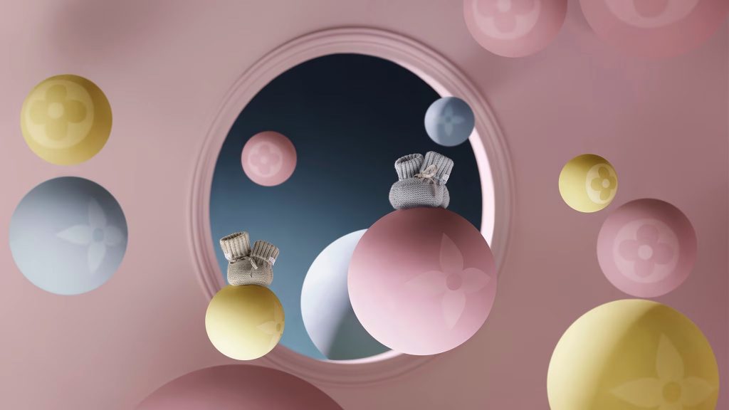 Nổi bật trong các tông màu pastel nhẹ nhàng là những bộ áo liền quần, áo khoác, đồ ngủ, mũ len, giày và vớ dành cho trẻ em cực kỳ đáng yêu. Tất nhiên chúng không thể thiếu huy hiệu và chữ lồng đầy biểu tượng của Louis Vuitton, hiện diện trên tất cả sản phẩm.