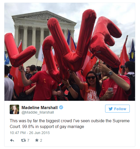 “Đây là đám đông lớn nhất mà tôi từng chứng kiến bên ngoài Tòa án tối cao. 99.8% ủng hộ cho hôn nhân đồng tính.” – Mardeline Marshall