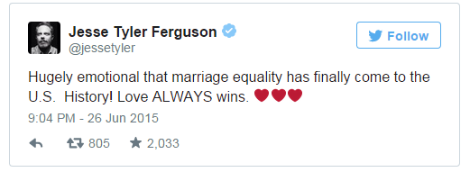 “Vô cùng xúc động khi hôn nhân bình đẳng cuối cùng đã đến với nước Mỹ. Tình yêu LUÔN LUÔN chiến thắng.” – Jesse Tyler Ferguson
