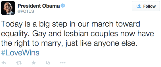 Tổng thống Obama đã chia sẻ trên Twitter của mình: “Những cặp đôi Gay và Lesbian có quyền kết hôn như bất cứ cặp đôi nào khác.
