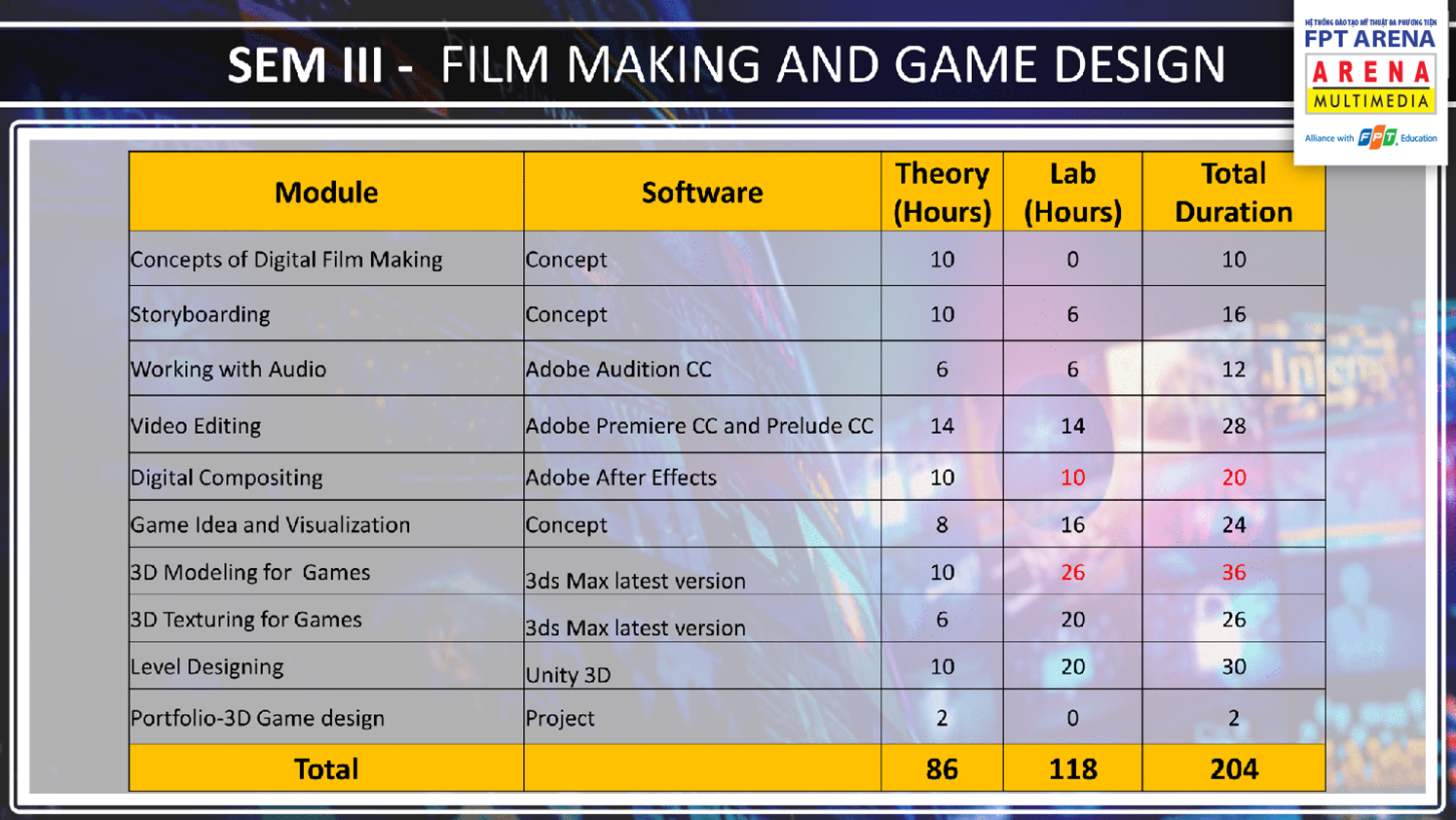 Bên cạnh việc đào tạo những công cụ thiết kế cơ bản, khi học ở FPT Arena học viên sẽ trải qua các môn học: ý tưởng và minh họa cho game, dựng mô hình 3D cho game, chất liệu cho game, thiết kế các cấp độ game, và đồ án làm game 3D. Những môn học mang tính thực tiễn, học viên được thực hành các dự án thiết kế game thực tế nên các học viên sau khi tốt nghiệp có đầy đủ kỹ năng để trở thành một người designer chuyên nghiệp.