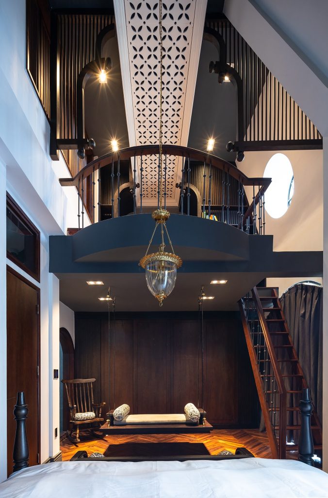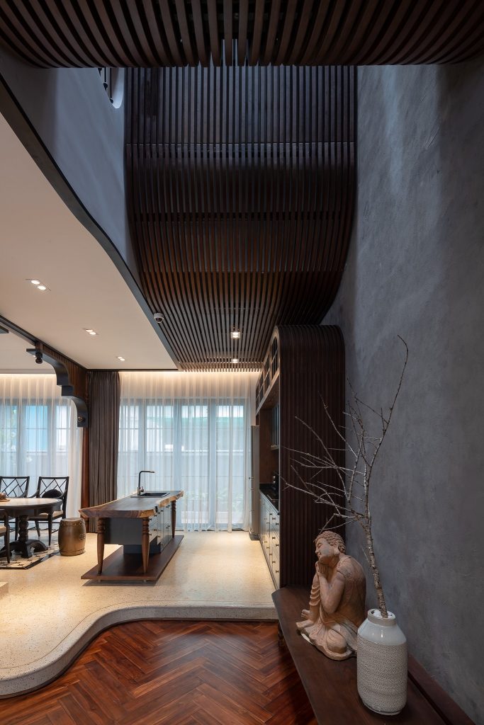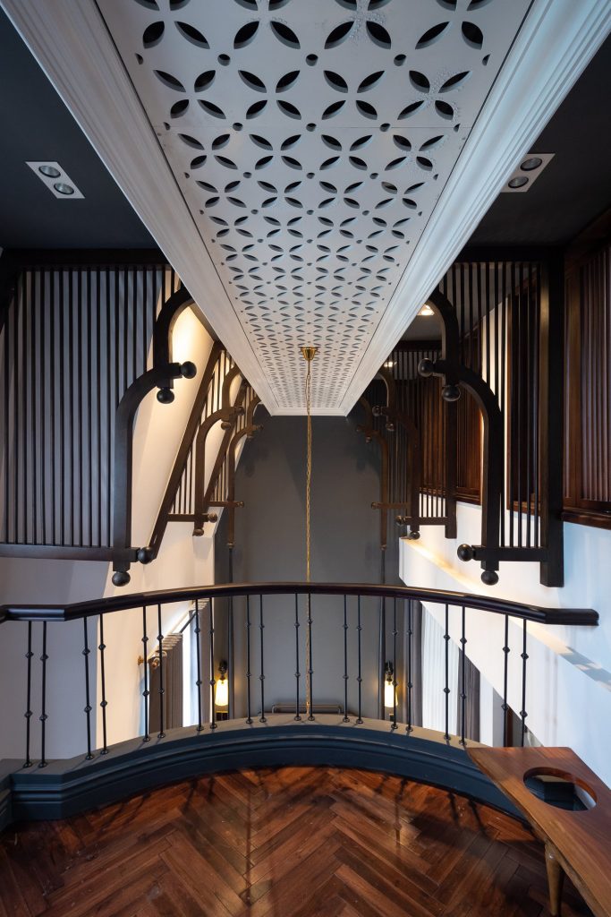 Cũng cái bếp, cũng hệ lam gỗ cong vút đấy nhưng cong một cách vô định không theo một kiểu cách nào. Tệ hơn nữa nó còn được liên kết bằng các hệ nan gỗ phụ tạm bợ bẻ làm đôi một cách cẩu thả. Từng nan gỗ bắn tạm bằng từng chiếc đinh ghim loang lỗ chỗ mà chỉ cần một cái chạm nhẹ cũng đủ lực làm rơi rụng. Nền sàn thì vô vàn các vết nứt to nhỏ khắp nơi, với chất liệu sàn Terazzo trắng – đá mài rất dễ bị ố vàng nếu không thi công đúng cách. Có thể đây là một khuyết điểm của vật liệu này nhưng nếu bạn là tín đồ của phong cách Indochine thì không thể không công nhận loại vật liệu này là một nguyên liệu quí giá tạo nên một tổng thể chỉn chu. Chưa hết, chiếc cầu thang có sẵn tưởng chừng cũng không phải khó khăn gì trong việc lắp ghép nhưng thực tế lại bị cong vẹo như những đường lượn cao tốc của trò chơi cảm giác mạnh. Cuộc chơi mạnh mẽ của một không gian ao ước đổ sụp bằng những kết quả kì quoặc.