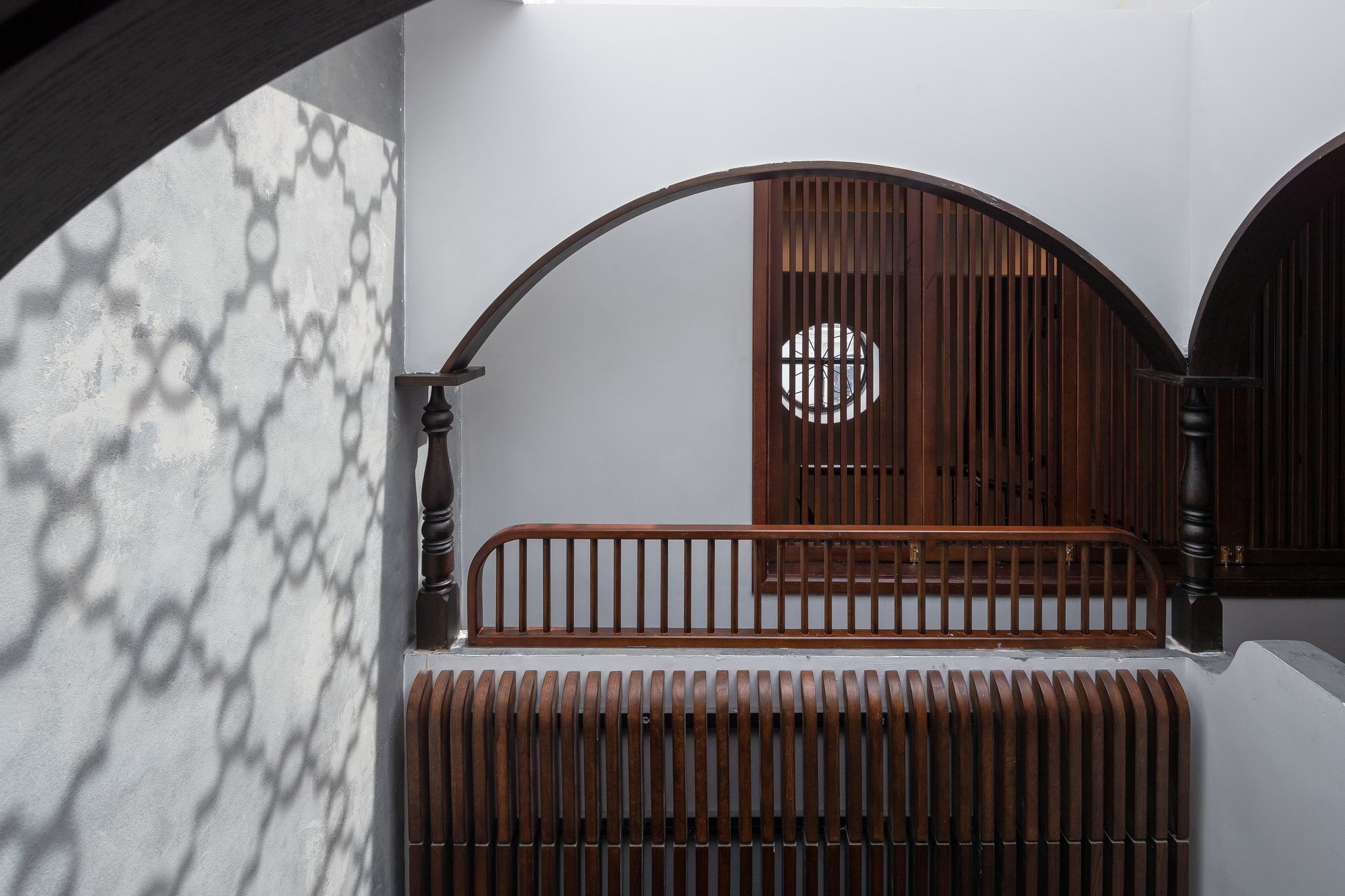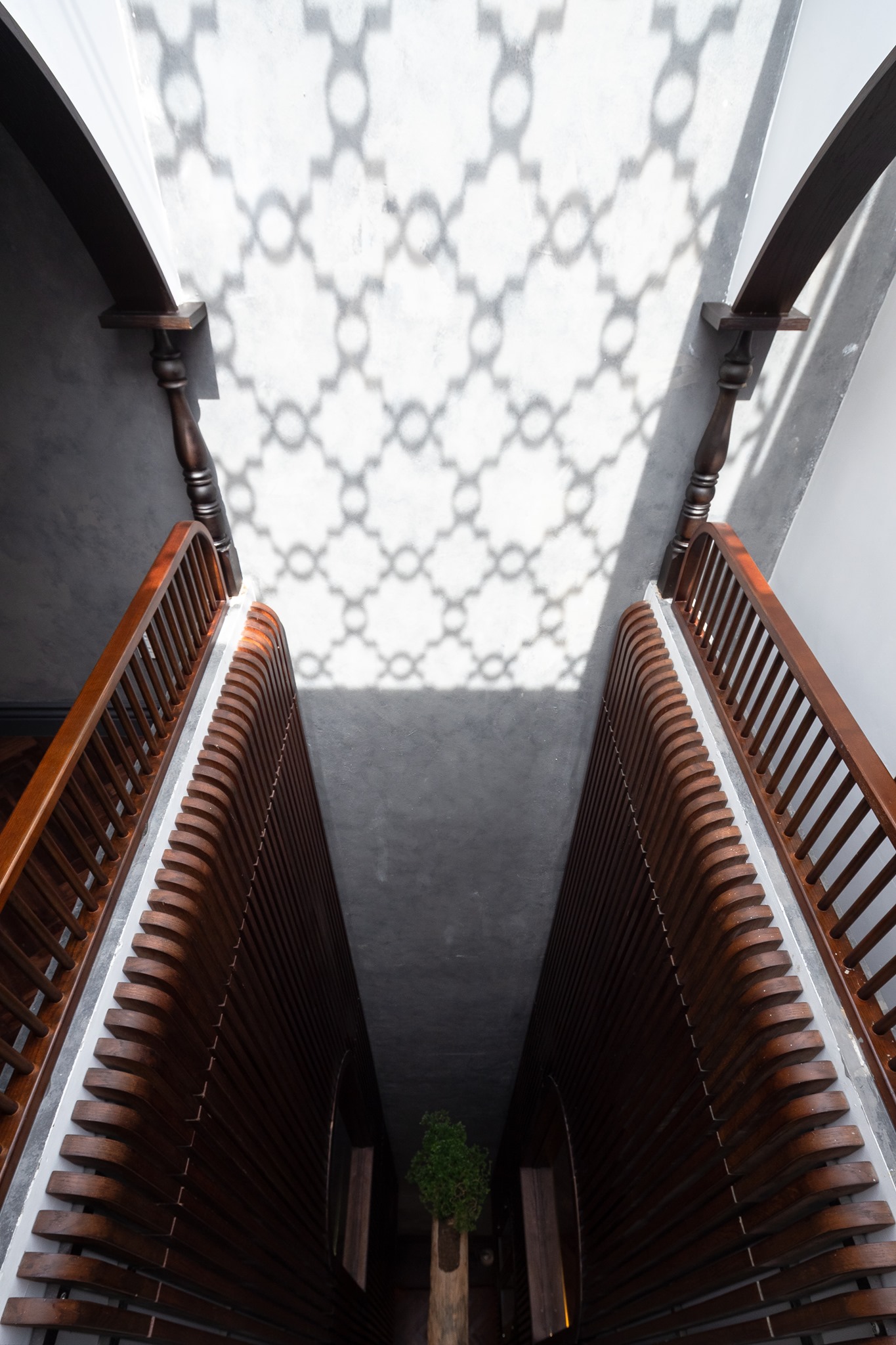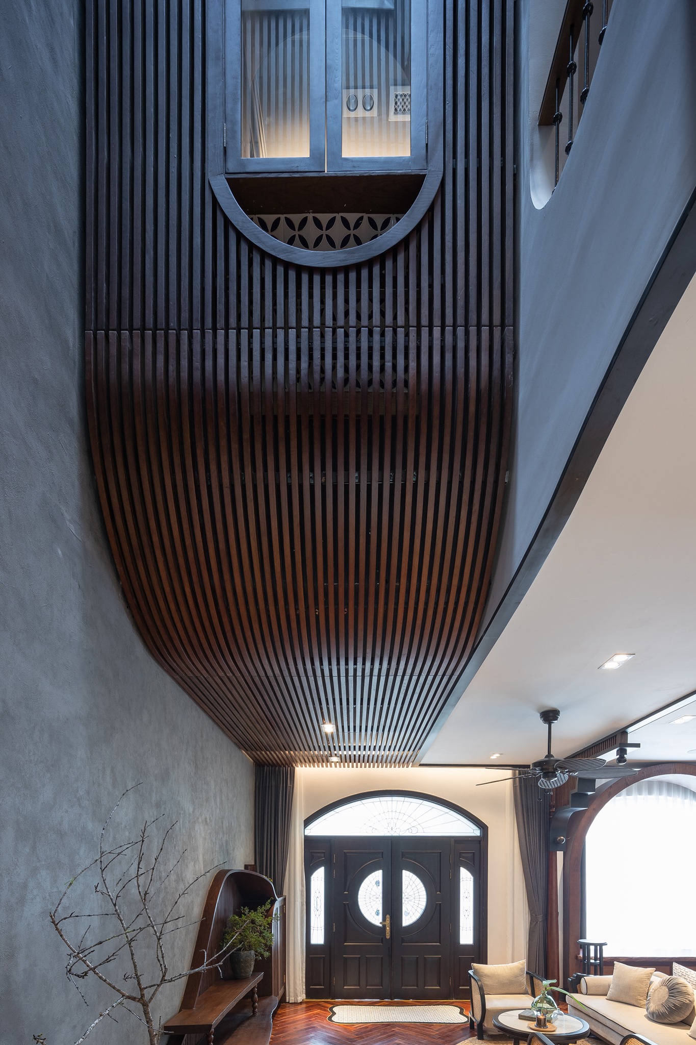 Cũng cái bếp, cũng hệ lam gỗ cong vút đấy nhưng cong một cách vô định không theo một kiểu cách nào. Tệ hơn nữa nó còn được liên kết bằng các hệ nan gỗ phụ tạm bợ bẻ làm đôi một cách cẩu thả. Từng nan gỗ bắn tạm bằng từng chiếc đinh ghim loang lỗ chỗ mà chỉ cần một cái chạm nhẹ cũng đủ lực làm rơi rụng. Nền sàn thì vô vàn các vết nứt to nhỏ khắp nơi, với chất liệu sàn Terazzo trắng – đá mài rất dễ bị ố vàng nếu không thi công đúng cách. Có thể đây là một khuyết điểm của vật liệu này nhưng nếu bạn là tín đồ của phong cách Indochine thì không thể không công nhận loại vật liệu này là một nguyên liệu quí giá tạo nên một tổng thể chỉn chu. Chưa hết, chiếc cầu thang có sẵn tưởng chừng cũng không phải khó khăn gì trong việc lắp ghép nhưng thực tế lại bị cong vẹo như những đường lượn cao tốc của trò chơi cảm giác mạnh. Cuộc chơi mạnh mẽ của một không gian ao ước đổ sụp bằng những kết quả kì quoặc.