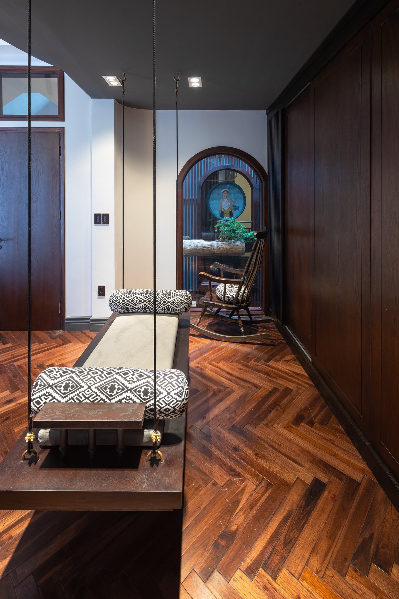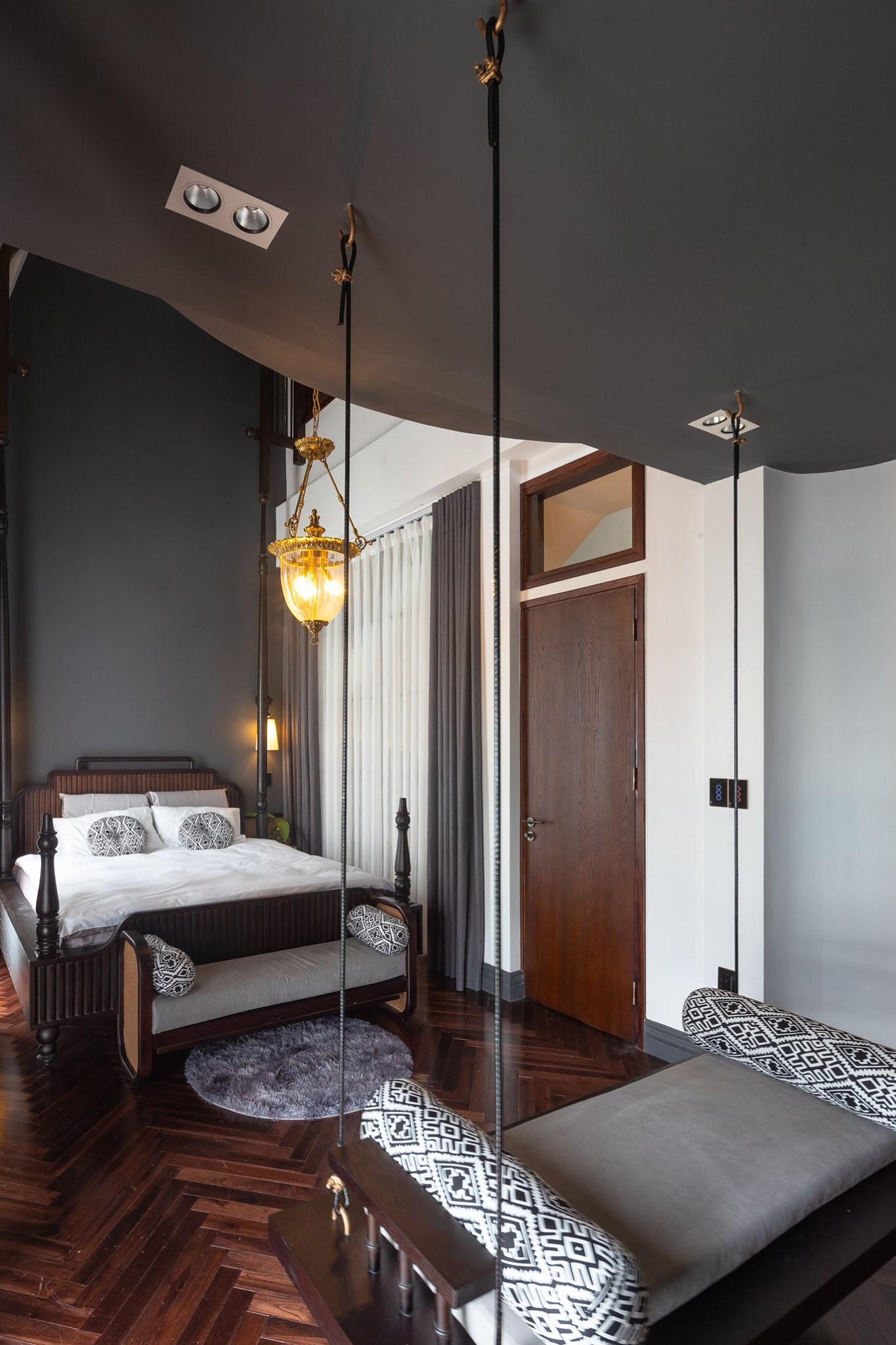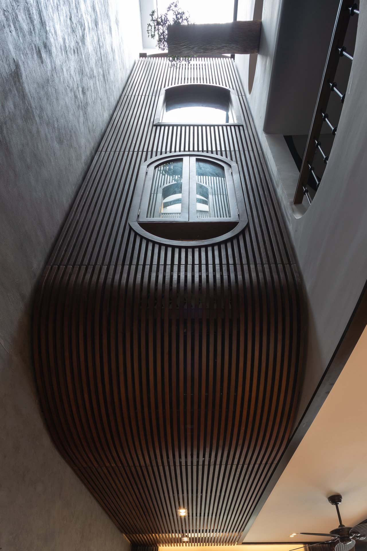 Cũng cái bếp, cũng hệ lam gỗ cong vút đấy nhưng cong một cách vô định không theo một kiểu cách nào. Tệ hơn nữa nó còn được liên kết bằng các hệ nan gỗ phụ tạm bợ bẻ làm đôi một cách cẩu thả. Từng nan gỗ bắn tạm bằng từng chiếc đinh ghim loang lỗ chỗ mà chỉ cần một cái chạm nhẹ cũng đủ lực làm rơi rụng. Nền sàn thì vô vàn các vết nứt to nhỏ khắp nơi, với chất liệu sàn Terazzo trắng – đá mài rất dễ bị ố vàng nếu không thi công đúng cách. Có thể đây là một khuyết điểm của vật liệu này nhưng nếu bạn là tín đồ của phong cách Indochine thì không thể không công nhận loại vật liệu này là một nguyên liệu quí giá tạo nên một tổng thể chỉn chu. Chưa hết, chiếc cầu thang có sẵn tưởng chừng cũng không phải khó khăn gì trong việc lắp ghép nhưng thực tế lại bị cong vẹo như những đường lượn cao tốc của trò chơi cảm giác mạnh. Cuộc chơi mạnh mẽ của một không gian ao ước đổ sụp bằng những kết quả kì quoặc.
