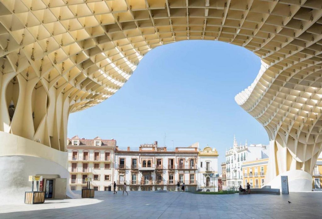 (Từ trái sang) Metropol Parasol ở Seville, Tây Ban Nha. Hình ảnh: Saurav Paswan. Khách sạn Hyatt Regency ở San Francisco, Mỹ. Hình ảnh: Robin Wechsler. Màu sắc rực rỡ trên các bức tường ở Puglia, Ý. Hình ảnh: Luigi Chiriaco.