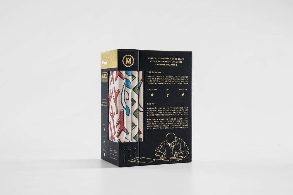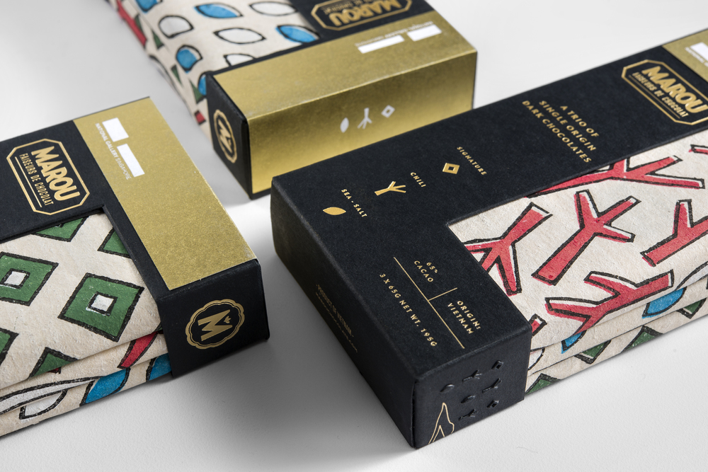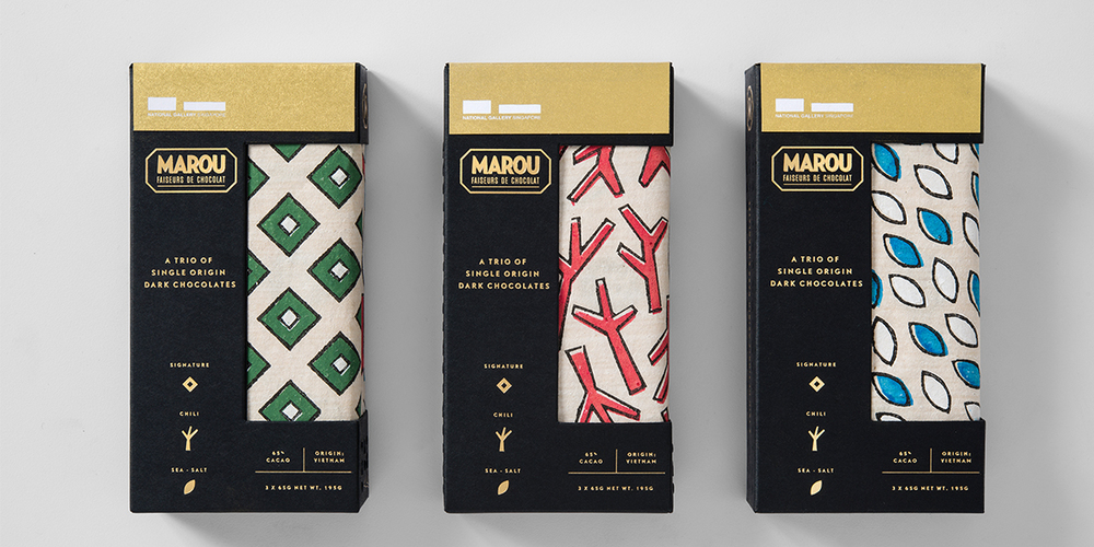 Một thương hiệu chocolate đặc biệt với một câu chuyện hấp dẫn đứng phía sau. Marou là một dòng socola nổi tiếng không chỉ vì sự phong phú, đậm đà của hương vị mà còn vì bao bì nổi bật của nó. Được thiết kế bởi Rice Creative, một dòng sản phẩm mới xuất hiện lấy cảm hứng từ kiến trúc của The National Gallery ở Singapore và tranh Đông Hồ của Việt Nam.