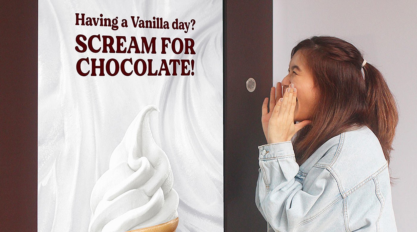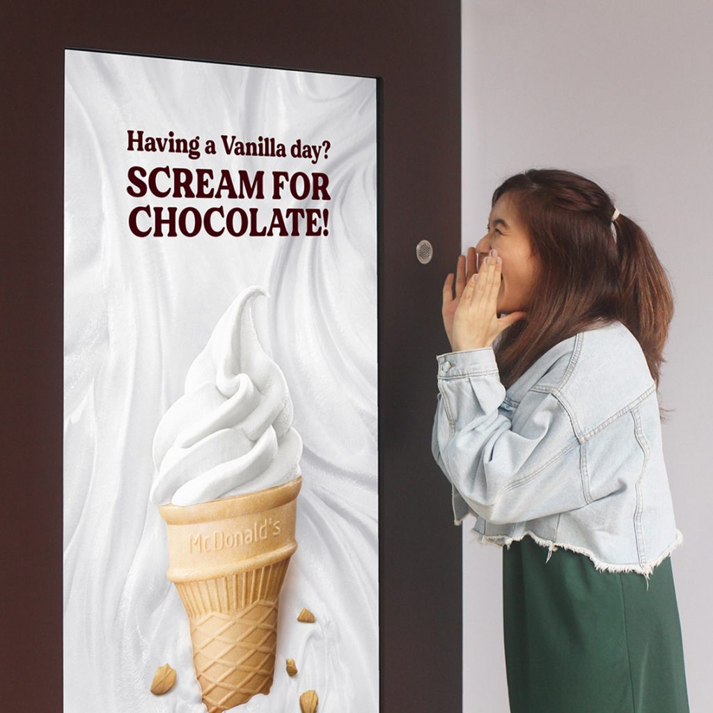 Để quảng cáo kem của mình, McDonald’s đã hợp tác với Leo Burnett cho lắp đặt một chiếc màn hình kỹ thuật số tương tác tại Funan Mall ở Singapore và sẽ thưởng một que kem Hershey’s cho bất kỳ ai có khả năng la hét đủ lớn. Có tên là Scream for Icecream, chiến dịch quảng bá này chứng kiến khung cảnh kỳ lạ khi nhiều người qua đường kêu gào khản cổ để nhận được một que kem miễn phí.