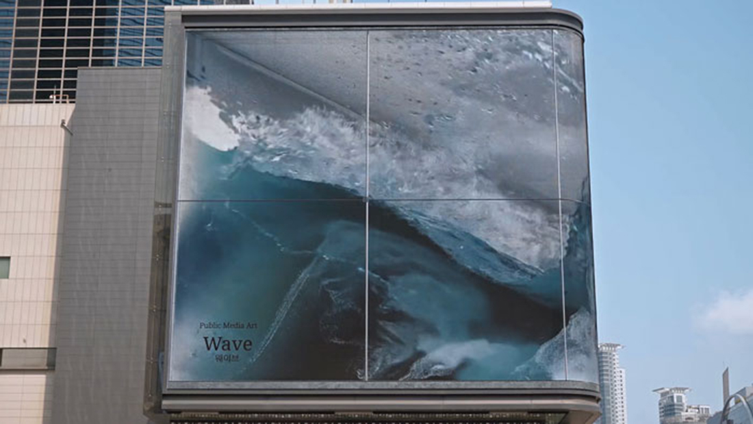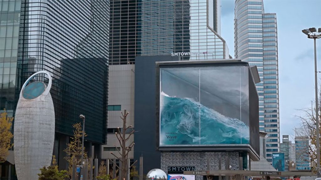 Seoul là nơi có biển quảng cáo lớn nhất tại Hàn Quốc, hiện đang được sử dụng làm “bể cá” cho một con sóng khổng lồ được mô phỏng trên máy tính với chuyển động liên tục không ngừng. Con sóng ngoạn mục này là một phần trong dự án Public Media Series của D’strict. Được đặt tên là #1_WAVE with Anamorphic illusion, đây có vẻ là sản phẩm đầu tiên trong series và sẽ có nhiều tác phẩm tiếp theo xuất hiện trong tương lai.