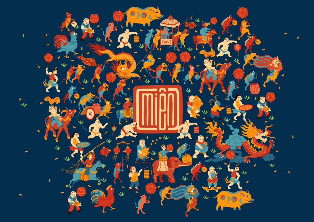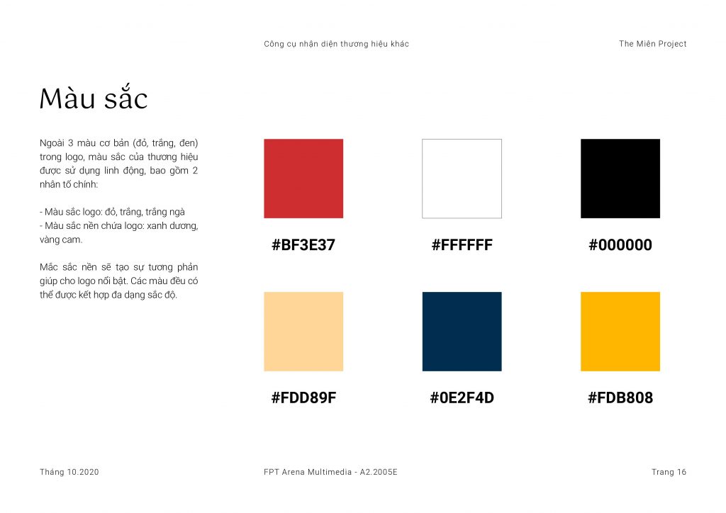 Logo có phần “cổ xưa” này được kết hợp với các font chữ hiện đại thể hiện tốt sự giao thoa mà thương hiệu đang hướng tới. Thêm vào đó, các màu sắc và hoa văn, hình ảnh bổ trợ đều được chọn lọc kỹ càng để khi đặt cạnh nhau được cân bằng, hài hòa. Cụ thể hơn, về Font chữ là sự phối hợp giữa Gotu và Roboto. Màu sắc chính được lựa chọn trong “The Miên Project” bao gồm: màu sắc logo: đỏ, trắng, trắng ngà. Sự tương phản của màu nền xanh dương với màu đỏ và vàng cam rất hiệu quả trong việc kích thích nhu cầu ẩm thực cũng như mang tới sự hài hòa trong mắt nhìn của người tiêu dùng.