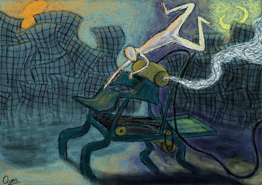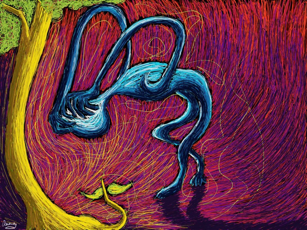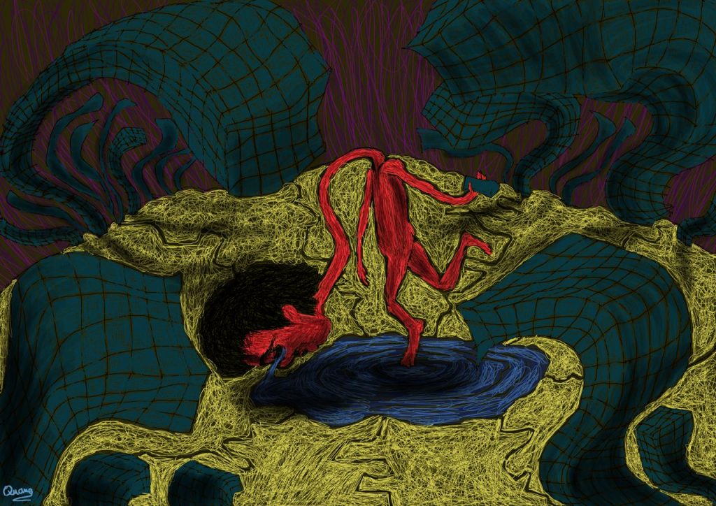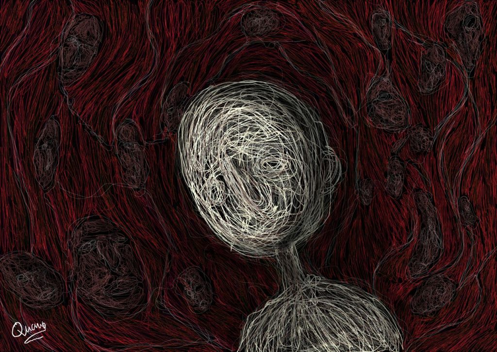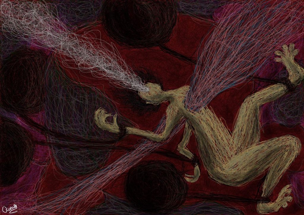 Đã có những giai đoạn anh chia sẻ với tôi cảm xúc cá nhân khá bức bách, không một tên gọi dành cho nó, thế là Quang thể nghiệm bằng những bức vẽ, càng nhiều, có thể kể đến bức ‘Rối’ hay ‘Kiềm’. “Sau khi mình đăng các bức tranh của mình lên những cộng đồng vẽ, nhiều bạn đã nhắn tin cho mình và bảo rằng tranh của mình ‘nói’ lên được những cảm xúc của các bạn