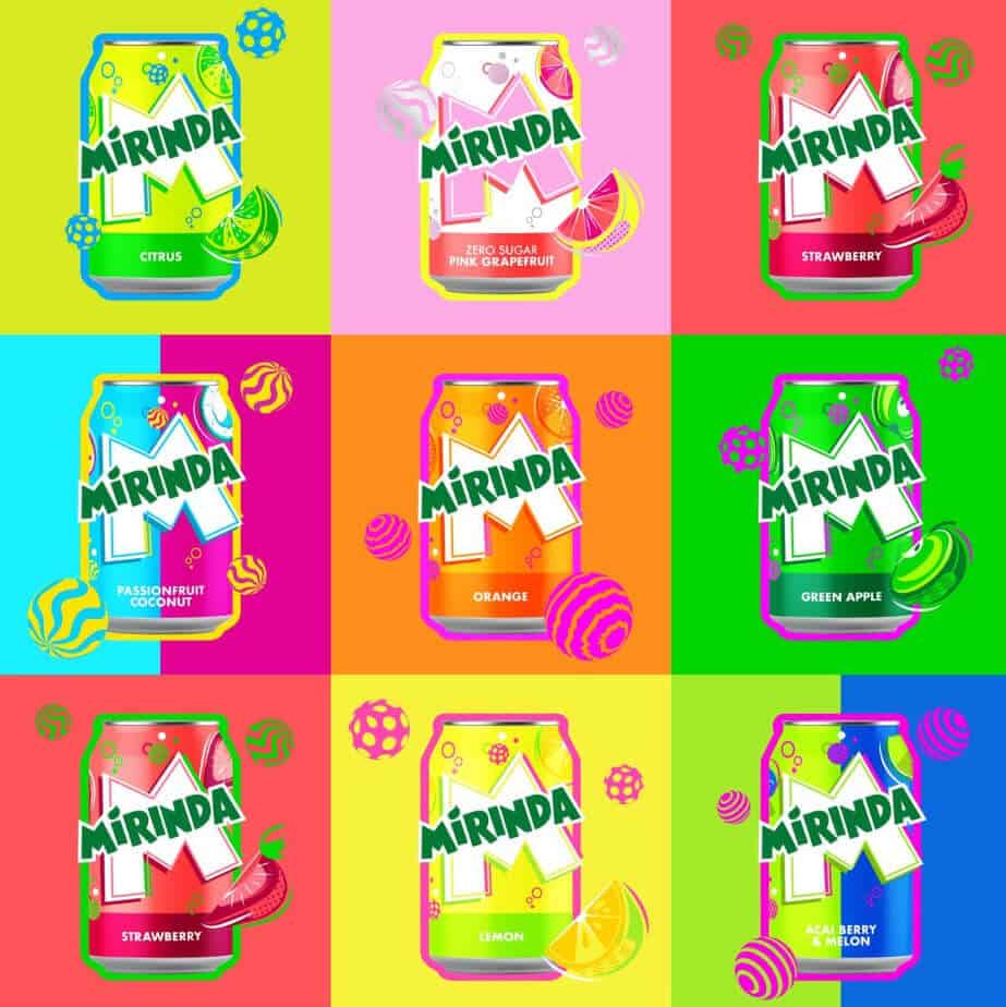 Mỗi hương vị trái cây trong số hơn 50 hương vị trái cây ngon khó cưỡng của thương hiệu, bao gồm Táo xanh, Cam, Dứa, Dâu và Dưa hấu được người hâm mộ yêu thích, sẽ có một bảng màu tương ứng, mỗi loại có cách phối màu tương phản, sống động riêng. Các sản phẩm mang hương vị sáng tạo của Mirinda được điều chỉnh phù hợp với khẩu vị độc đáo của các cộng đồng trên khắp thế giới, bao gồm Soda Kem Xanh và Me Cam ở Việt Nam, và Acai Berry ở Ba Lan. Bộ nhận diện hình ảnh mới sẽ hiện diện trên tất cả các lon Mirinda, hàng hóa, quảng cáo, các điểm bán lẻ, phương tiện kỹ thuật số và bất kỳ nơi nào khác có sự hiện diện của Mirinda trên 200 thị trường của hãng.