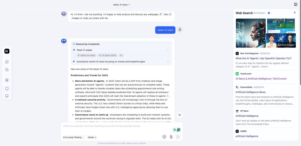 Theo đánh giá, Kimi AI 1.5 không chỉ đơn thuần là một chatbot, nó được thiết kế với khả năng suy luận đa phương thức (multimodal reasoning) với khả năng hiểu ngữ cảnh phức tạp và xử lý dữ liệu trong thời gian thực. Theo đó, Kimi AI 1.5 cho phép xử lý các đầu vào phức tạp như văn bản, hình ảnh và cả mã lập trình.
