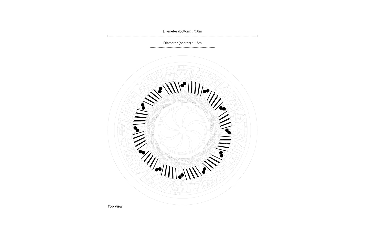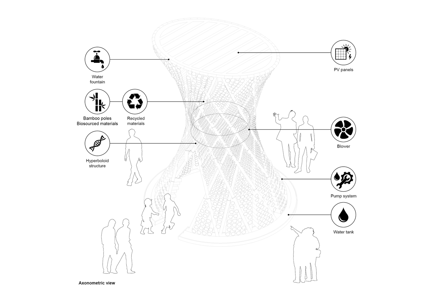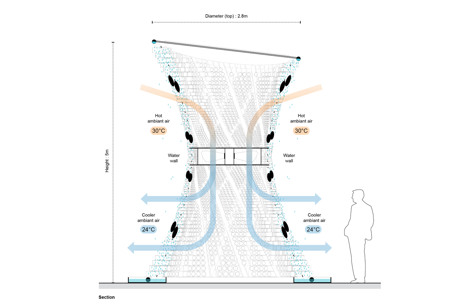 Mô hình là một tháp tre được thiết kế dưới hình dạng hyperboloid để ổn định cấu trúc. Giữa các thanh trục chính được thiết lập một phương tiện để nước có thể qua đó chảy theo trọng lực. Một máy thổi được lắp đặt tại trung tâm của cấu trúc để thổi khí nóng từ trên cao và đẩy nó khung bên dưới. Khi đó không khí nóng vượt qua “bức tường nước” hai lần và được làm mát theo một cách hoàn toàn tự nhiên.