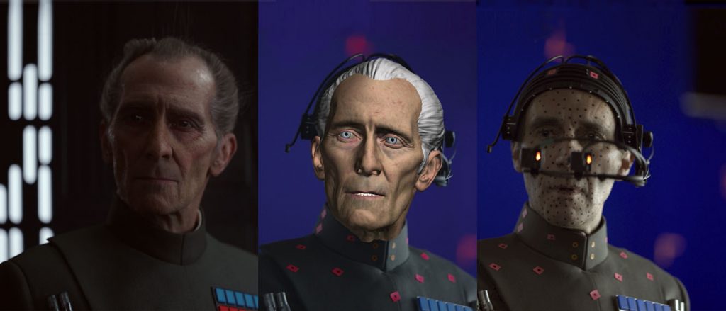 Để dựng lại những nét mặt, cử chỉ, chuyển động của Grand Moff Tarkin, một diễn viên khác có tên là Guy Henry được giao nhiệm vụ đóng thay Peter Cushing. Công nghệ này yêu cầu nhiều bản quét khác nhau cần phải hoàn thành trước khi diễn viên thực hiện cảnh quay trên phim trường.