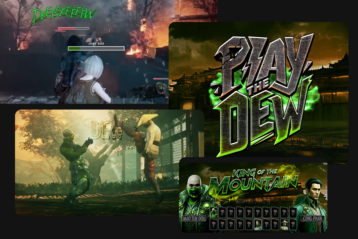 Từ phát hiện này, chiến dịch “PLAY THE DEW” ra đời với một loạt phim mô phỏng các tình huống quen thuộc trong game, biên tập lại những khoảnh khắc trong hàng loạt trò chơi nổi tiếng từ MOBA đến FPS. Điểm đặc biệt là toàn bộ phần âm thanh đều được tạo ra từ các bản ghi âm chỉ với từ “DEW”. Điều này không chỉ tạo nên sự hài hước mà còn chứng minh một cách hài hước rằng Mountain Dew luôn “hiện diện” trong mọi trận game, chỉ là game thủ chưa từng để ý.