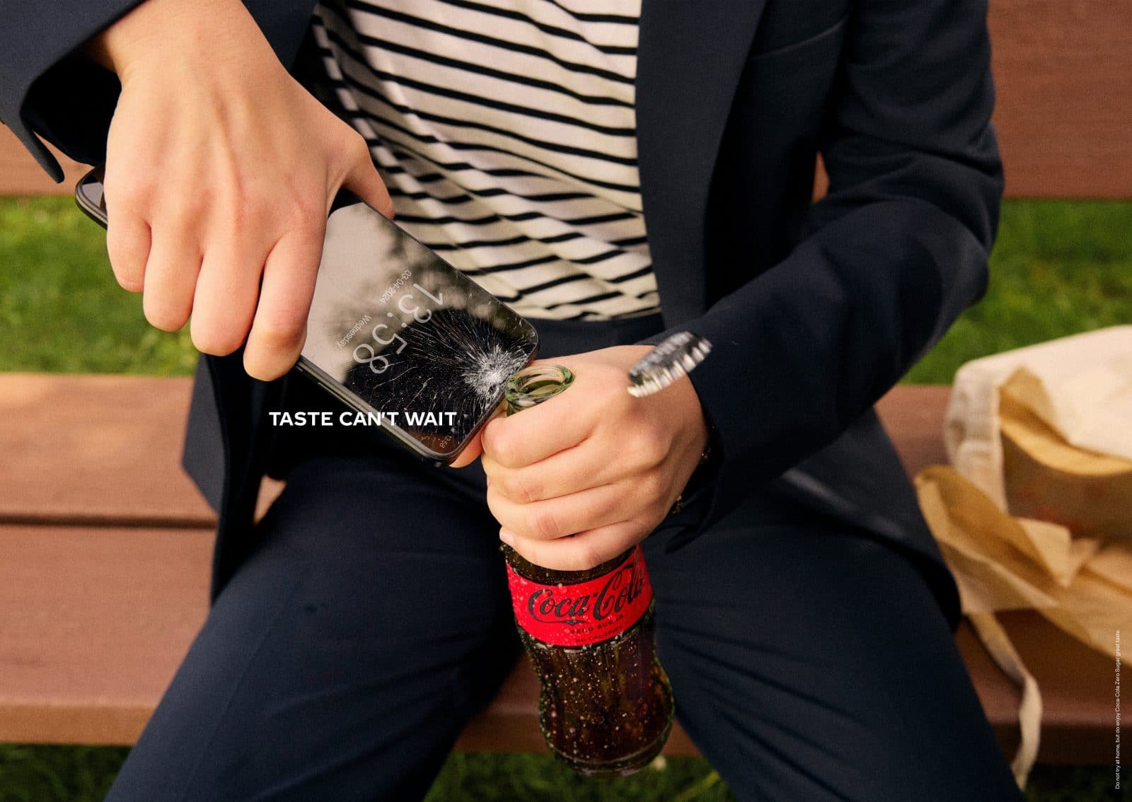 Trong chiến dịch quảng cáo mới nhất của mình có tên ‘Taste Can’t Wait’ (tạm dịch: Hương vị không thể chờ đợi), Coca-Cola đã giải quyết vấn đề này một cách khéo léo. Tiền đề rất rõ ràng: khi nói đến hương vị thơm ngon của Coca-Cola, chờ đợi tìm đồ khui không phải là một lựa chọn khả thi. Thay vì đó, mọi người có thể tìm thấy cho mình một cách thật thú vị để thưởng thức ngay lập tức chai Coca-Cola yêu thích qua loạt Print Ad thú vị: minh hoạ muôn kiểu khui chai bằng các đồ dùng phổ biến trong cuộc sống như điện thoại di động, cạnh bàn, chìa khoá…