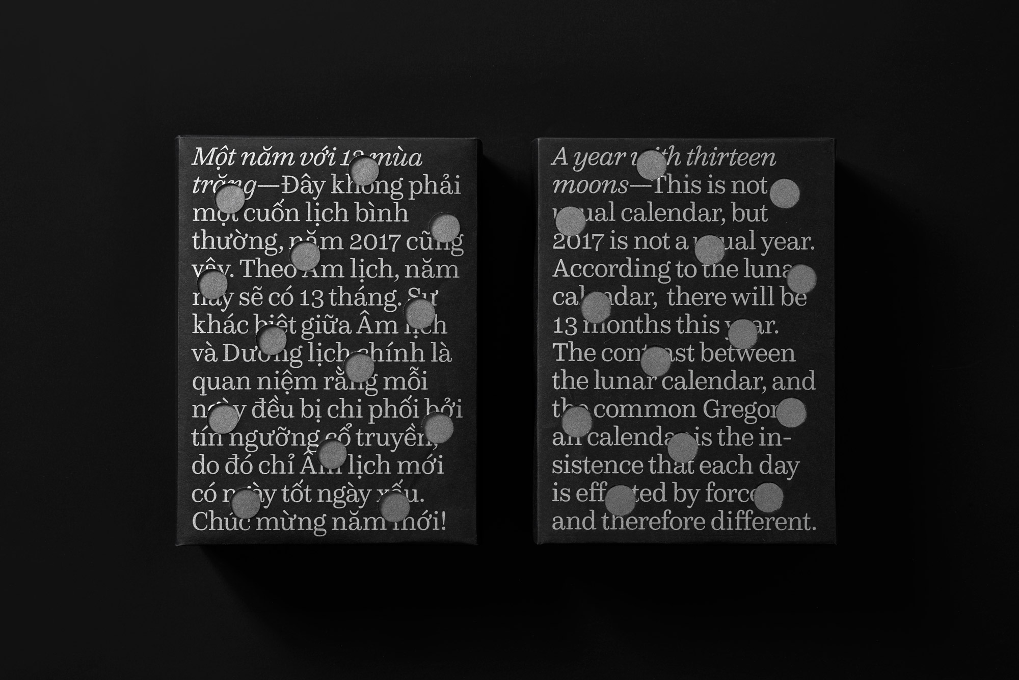 Thu hút bởi những thông tin mà chỉ Âm lịch Việt Nam có được, từ đó Rice Creative đã thiết kế một cuốn lịch chỉ diễn tả những thông tin này. Theo phong tục và tín ngưỡng của người Việt, mỗi ngày bị chi phối bởi những yếu tố siêu hình, và vì thế mà khác biệt. Để diễn tả khái niệm này, chúng tôi sử dụng các chữ số tìm được từ sách cũ, từ đó mang lại hình dáng hoàn toàn mới cho một sản phẩm đậm chất truyền thống.