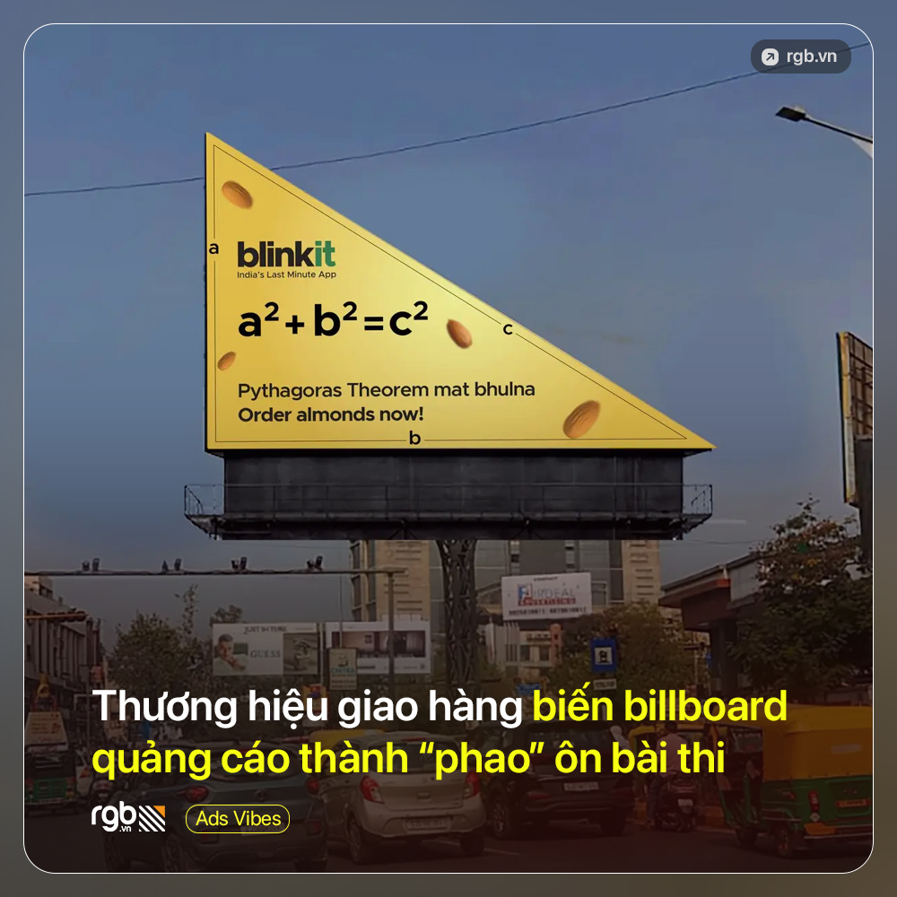 Thay vì quảng cáo theo cách truyền thống, Blinkit tận dụng những gì quen thuộc với sinh viên. Các biển quảng cáo hiển thị những công thức nổi tiếng như định lý Pythagore hay công thức diện tích hình tròn.
