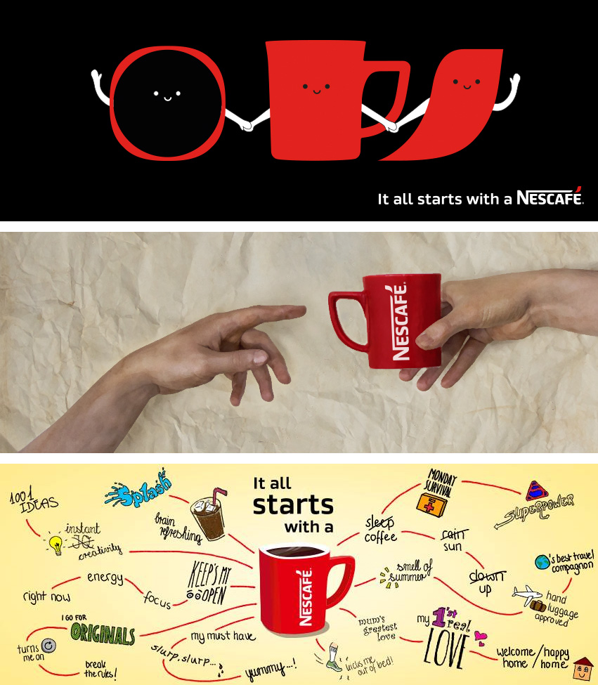 Những thay đổi trên đây bao gồm màu đỏ biểu trưng đã được cách tân hiện đại hơn, biểu tượng chiếc ly (mug) đỏ truyền thống của Nescafe và một điểm nhấn đồ họa độc đáo lấy ý tưởng từ khoảng hở của quai cầm ly. Khoảng trắng từ ảnh chụp trực diện ly café đã được cắt rời làm biểu tượng trên logo thương hiệu, hình ảnh này dễ khiến nhiều người liên tưởng đến biểu tượng chú chim sáo nhỏ trên logo thương hiệu mẹ Nestle (hình tổ chim). Phát hiện trùng hợp này khiến nhiều người tiêu dùng thích thú và điểm nhấn đó nay càng làm nổi bật biểu tượng chiếc ly đỏ vốn đã làm nên tên tuổi thương hiệu Nescafe.”