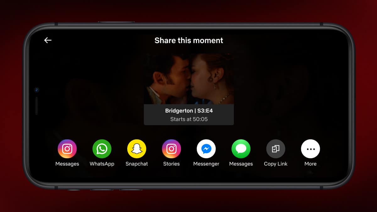 Bạn cũng có thể chia sẻ những đoạn phim ngắn trong kho Moments lên Instagram, Facebook và các mạng xã hội khác một cách dễ dàng. Người dùng có thể chia sẻ ngay khi vừa lưu hoặc chọn từ mục My Netflix và nhấn chia sẻ để lan tỏa khoảnh khắc phim yêu thích trên các nền tảng của mình. Tuy nhiên, người dùng vẫn chưa thể chụp ảnh màn hình, vì ảnh chụp từ Netflix vẫn hiện khung đen.
