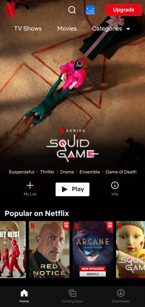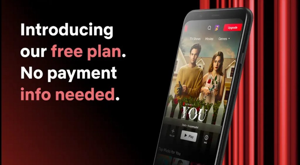 Giao diện gói miễn phí tương tự các gói trả phí. Người dùng có thể tạo năm hồ sơ xem phim khác nhau và cũng có tính năng quản lý trẻ em. Tất cả các nội dung gốc Netflix Original được cung cấp miễn phí, như Squid Game, Money Heist, SAS