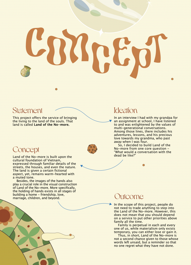 Phần nghiên cứu (Research), Nga kể với tôi với đầy sự chân thành, “thật ra mình đã nghiên cứu rất nhiều về tháng Cô Hồn, nhưng chưa có sử dụng nó”. Bên cạnh đó, cô cũng xem những bộ phim liên quan về chủ đề vùng đất linh hồn: Soul, Coco và Mirror.