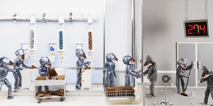 Cô đặc biệt thích thú với việc tái tạo lại cảnh sản xuất hàng loạt của công nhân, thể hiện quan điểm về xã hội tiêu dùng công nghiệp của con người, và khéo léo nêu bật những vấn đề khá nghiêm trọng theo một cách dí dỏm. Tiến sĩ Didier Rouzeyrol đã dùng thơ để miêu tả tác phẩm của cô như sau: