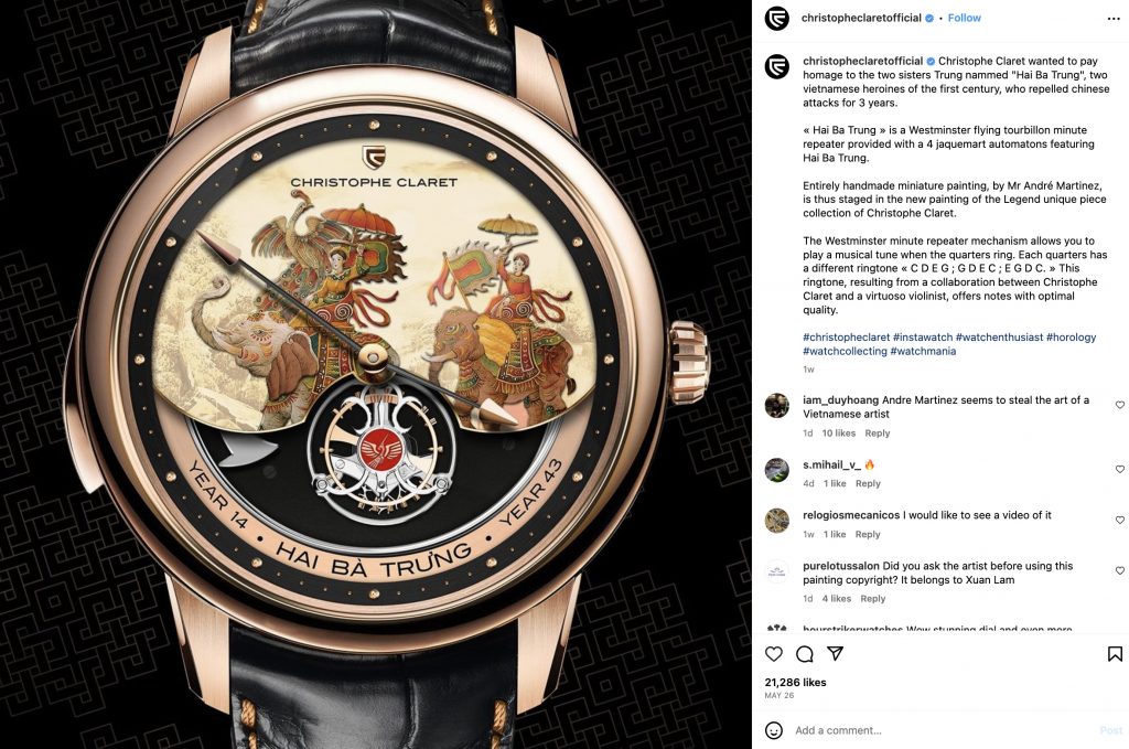 Trong khi rất nhiều người Việt cũng như người nước ngoài thích thú với chiếc đồng hồ Thụy Sĩ Christophe Claret vẽ Hai Bà Trưng lên mặt đồng hồ, có nhiều người nhận định tranh trên đồng hồ ‘đạo’ tranh của họa sĩ trẻ Xuân Lam.