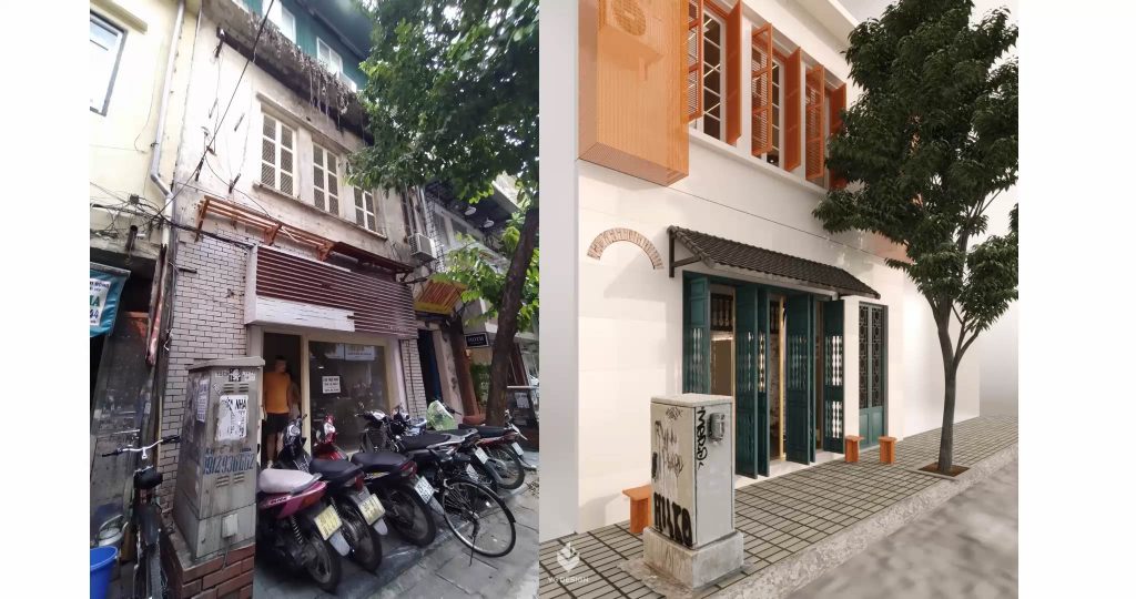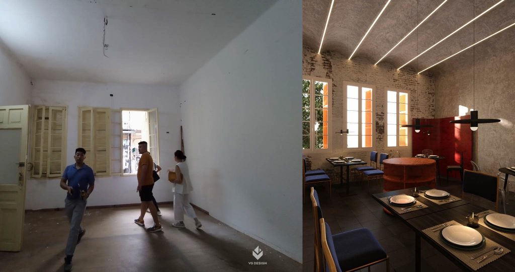 Khi bắt tay vào hình thành ý tưởng thiết kế cho công trình, VG Design đã đặt mục tiêu không chỉ tôn vinh những vẻ đẹp của ngôi nhà cổ Hà Nội mà còn cần thể hiện rằng, Ngoặm là nơi ghi lại những kỷ niệm của chủ nhà hàng về những trải nghiệm khi xa nhà và cả ký ức về gia đình,… Để đạt được điều đó thì VG team đã nghiên cứu rất kỹ những yếu tố mang tính địa phương và lịch sử, nhưng không chỉ của Hà Nội mà còn khai thác và lắng nghe những câu chuyện từ chủ đầu tư.